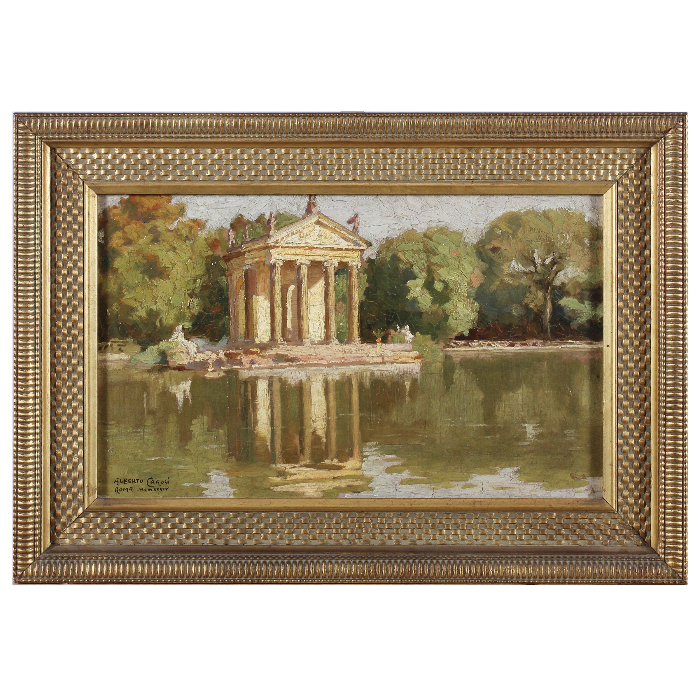 Roma 1891 - 1967 'Il tempio di Esculapio a Villa Borghese', 1934, olio su cartone, firmato e datato in basso a sinistra, entro cornice