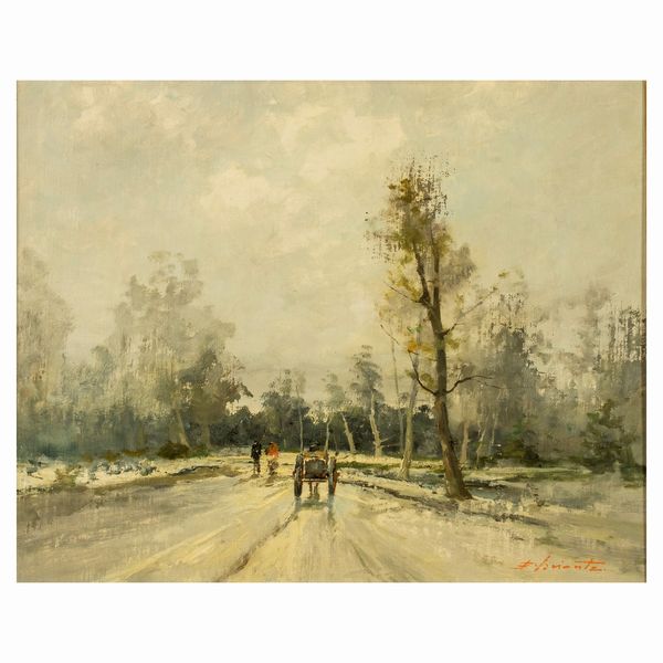 Napoli 1901 - Roma 1971 'Paesaggio invernale', olio su tela applicata su cartone, firmato in basso a destra, entro cornice
