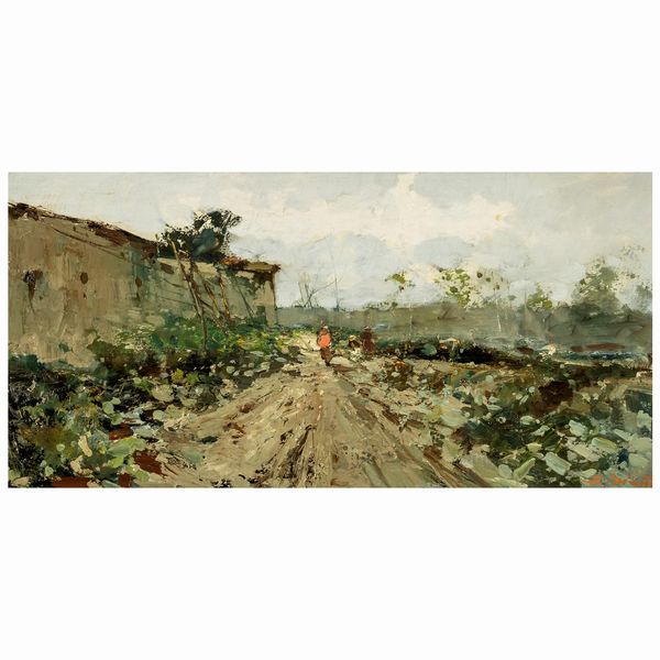 Napoli 1901 - Roma 1971 'Sentiero con figure', olio su cartone, firmato in basso a destra, entro cornice