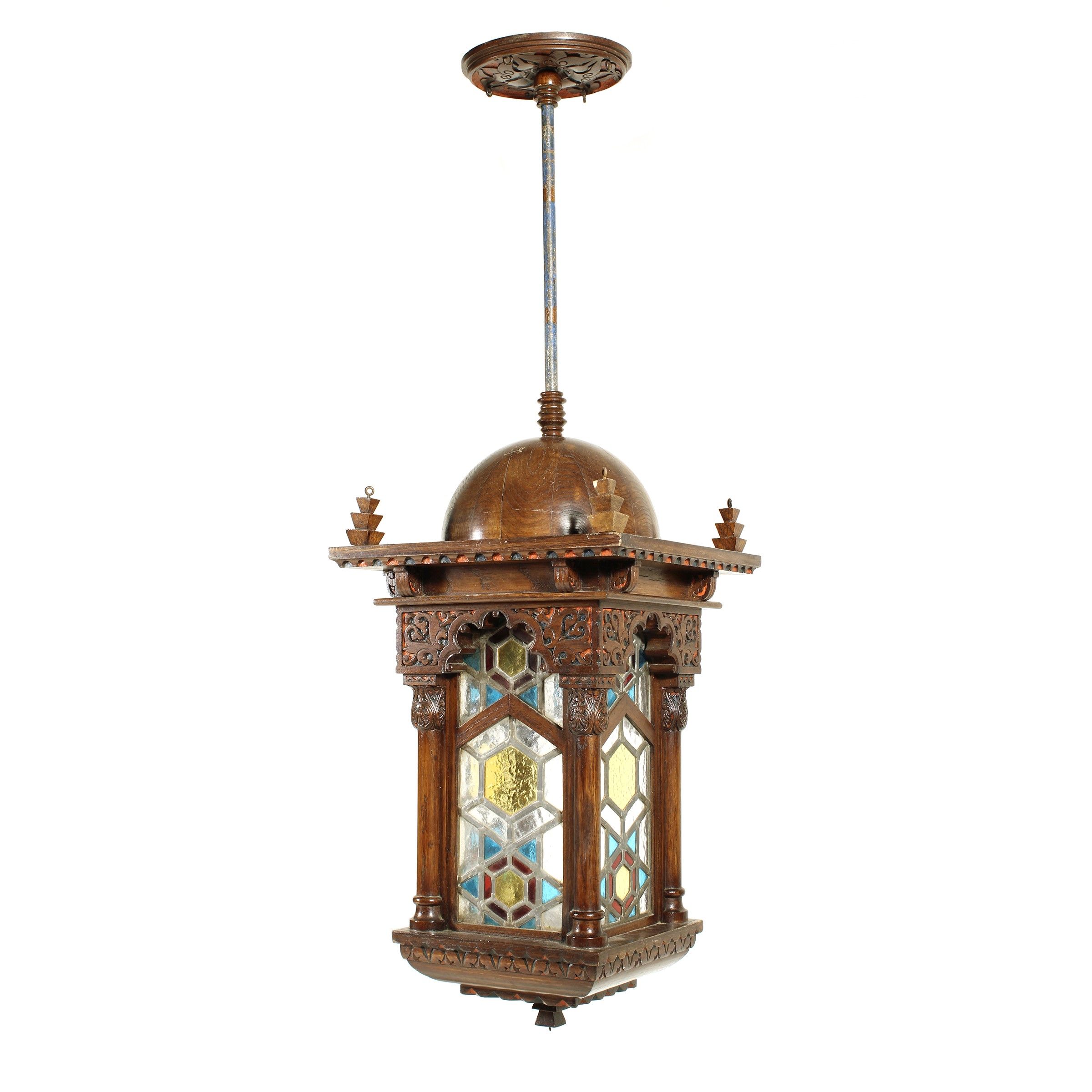 inizio XX Sec. lanterna in legno, ferro battuto e vetro colorato, difetti