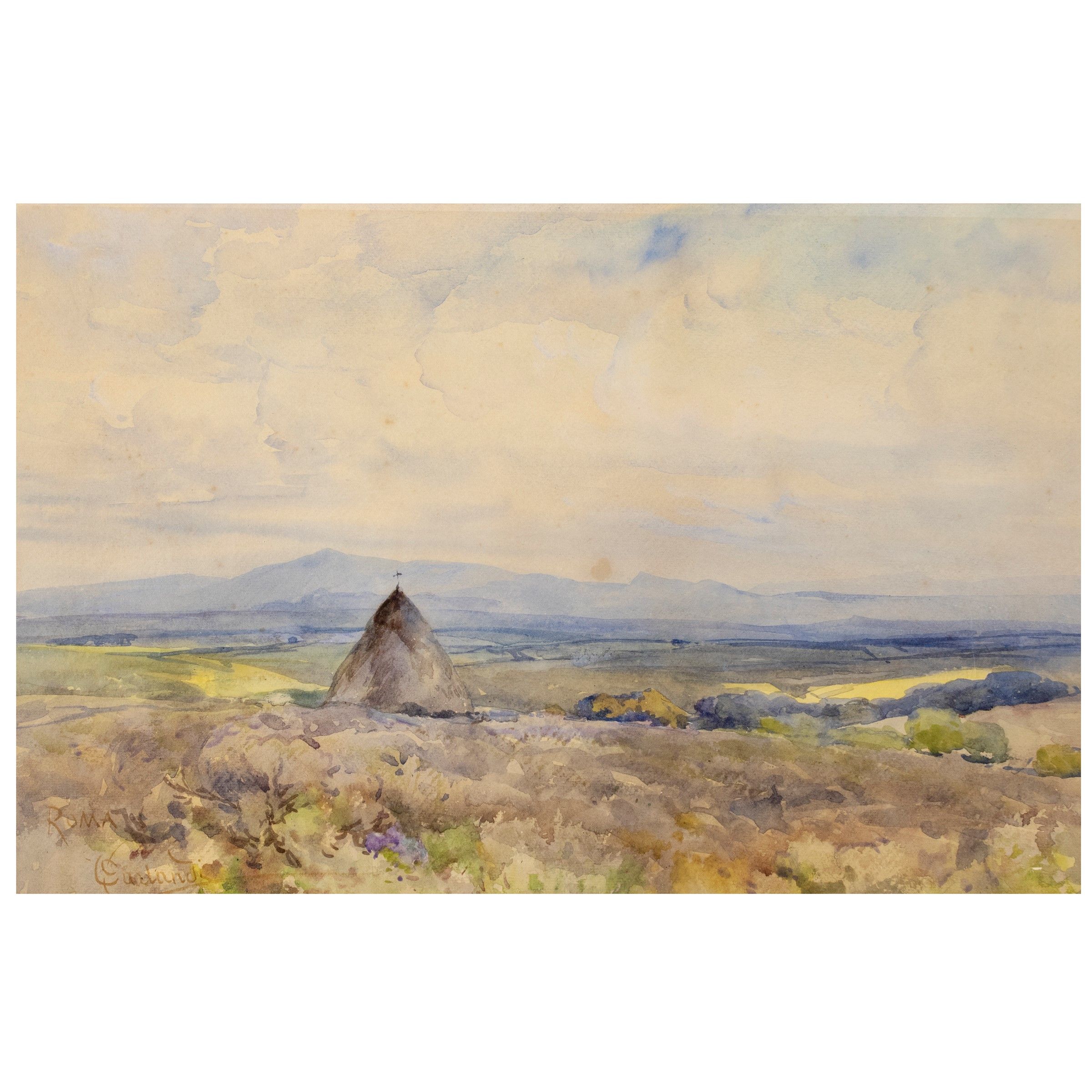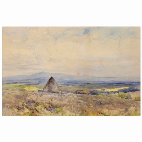 Roma 1848 - 1939 'Paesaggio con covone di fieno', acquerello su carta, firmato in basso a sinistra, entro cornice