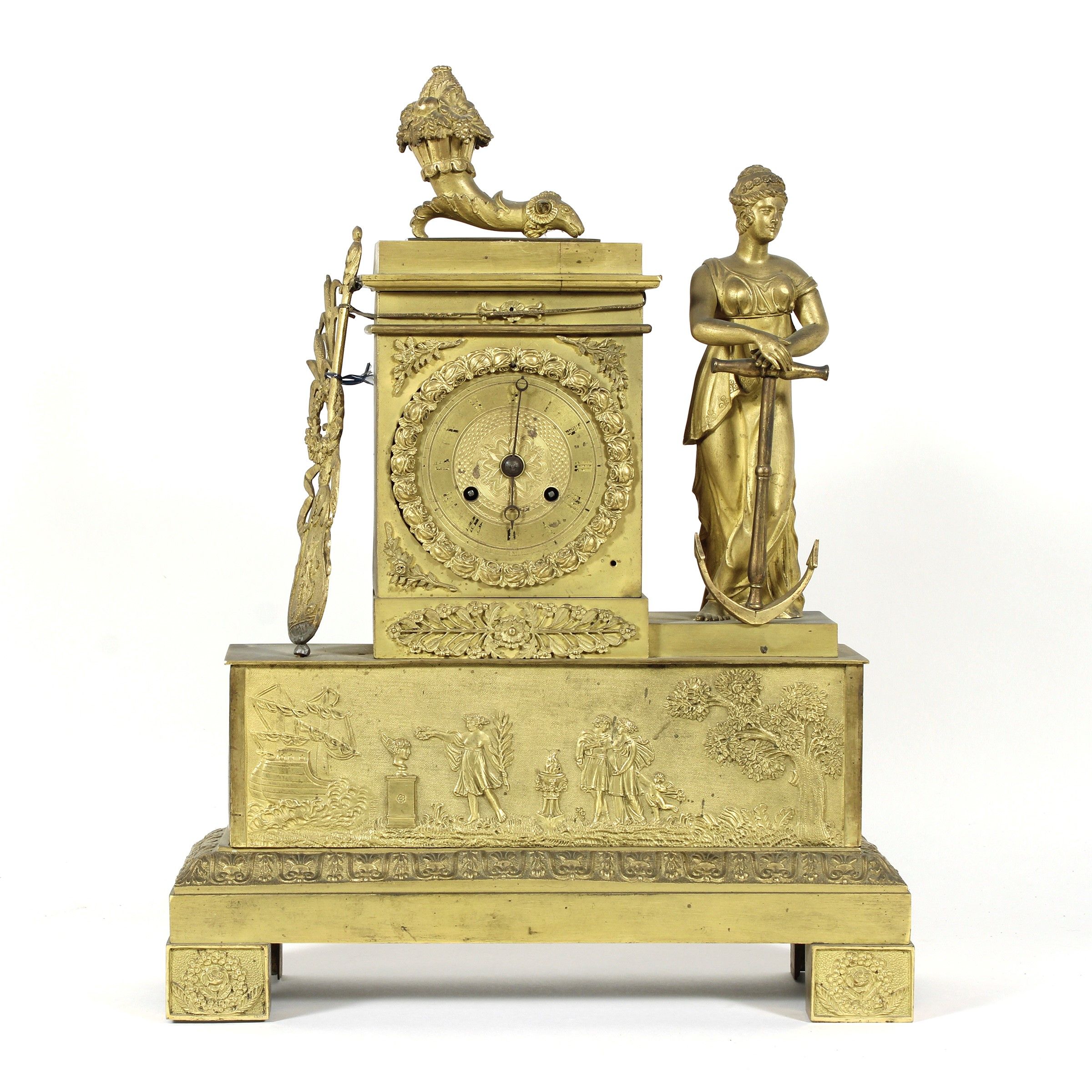 41x31x9,5 cm. Francia, XIX Sec. quadrante circolare con numeri romani sormontato da una cornucopia con terminale a testa d'ariete, ai lati una figura femminile con ancora e insegna con motivi marini, base rettangolare decorata con una scena mitologica, difetti