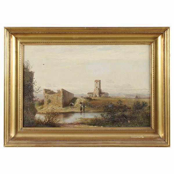 XIX Sec. 'Paesaggio con figure', 1812, olio su tela, siglato H. F. e datato in basso a sinistra, entro cornice