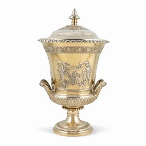 h. 44 cm. Londra, 1827 corpo baccellato e cesellato con tralci di vite, manici sagomati a foggia di volute vegetali, [..]