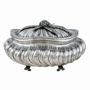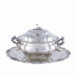 zuppiera 24x49x37 cm. - pressentoire 49x38 cm. Londra, 1813 orafo Paul Storr, corpo di sbalzato con bordo ornato [..]