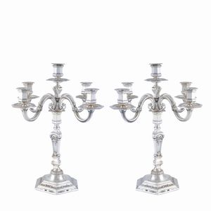 h. 47,5 cm. Italia, XX Sec. base ottagonale, fusto tornito con motivi vegetali e floreali, bracci di linea sagomata, [..]