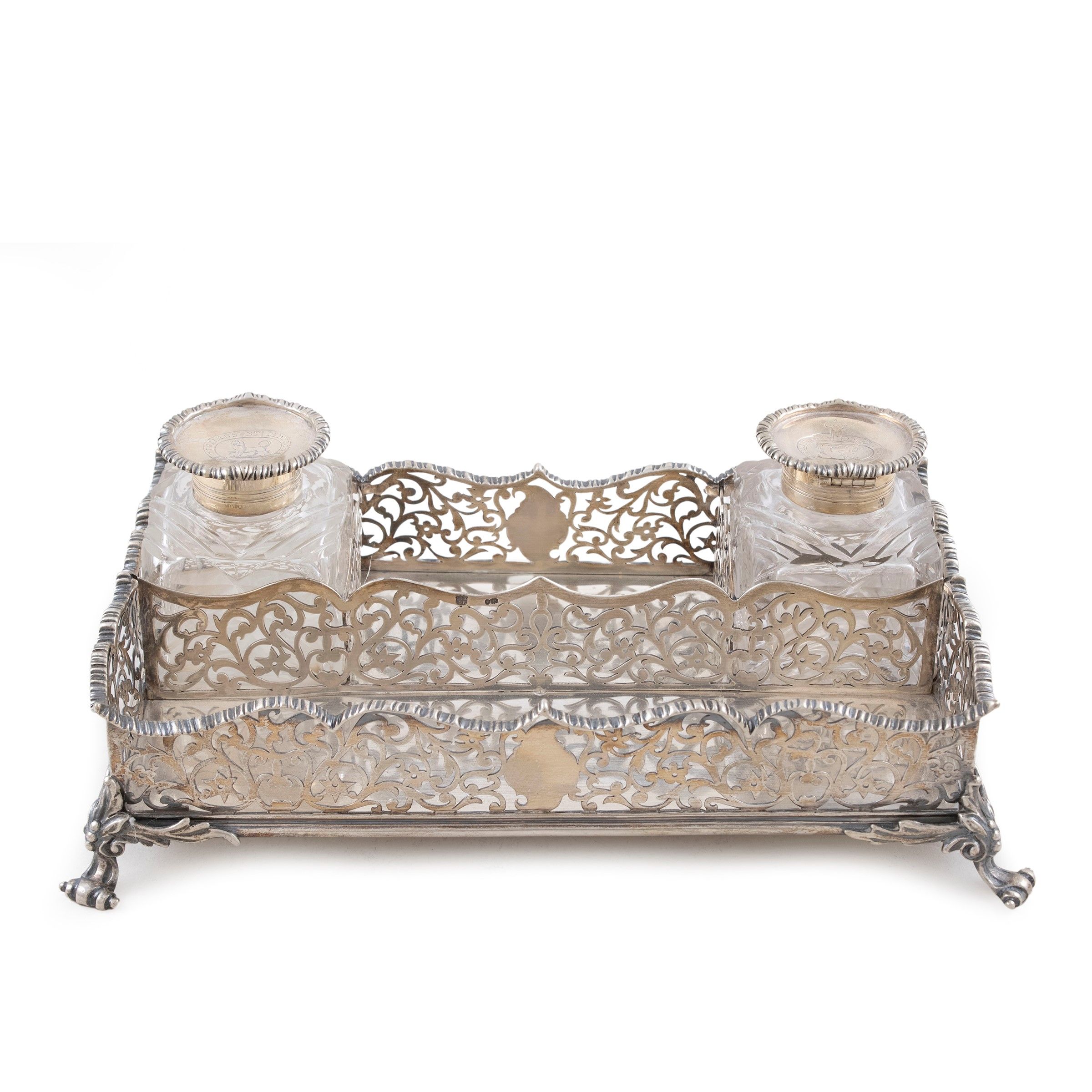 Londra, 1851 orafi Charles Thomas Fox & George Fox, corpo rettangolare traforato con volute vegetali, poggiante su quattro piedini a riccio, completo di due ampolle in vetro molato, peso netto 650 gr.