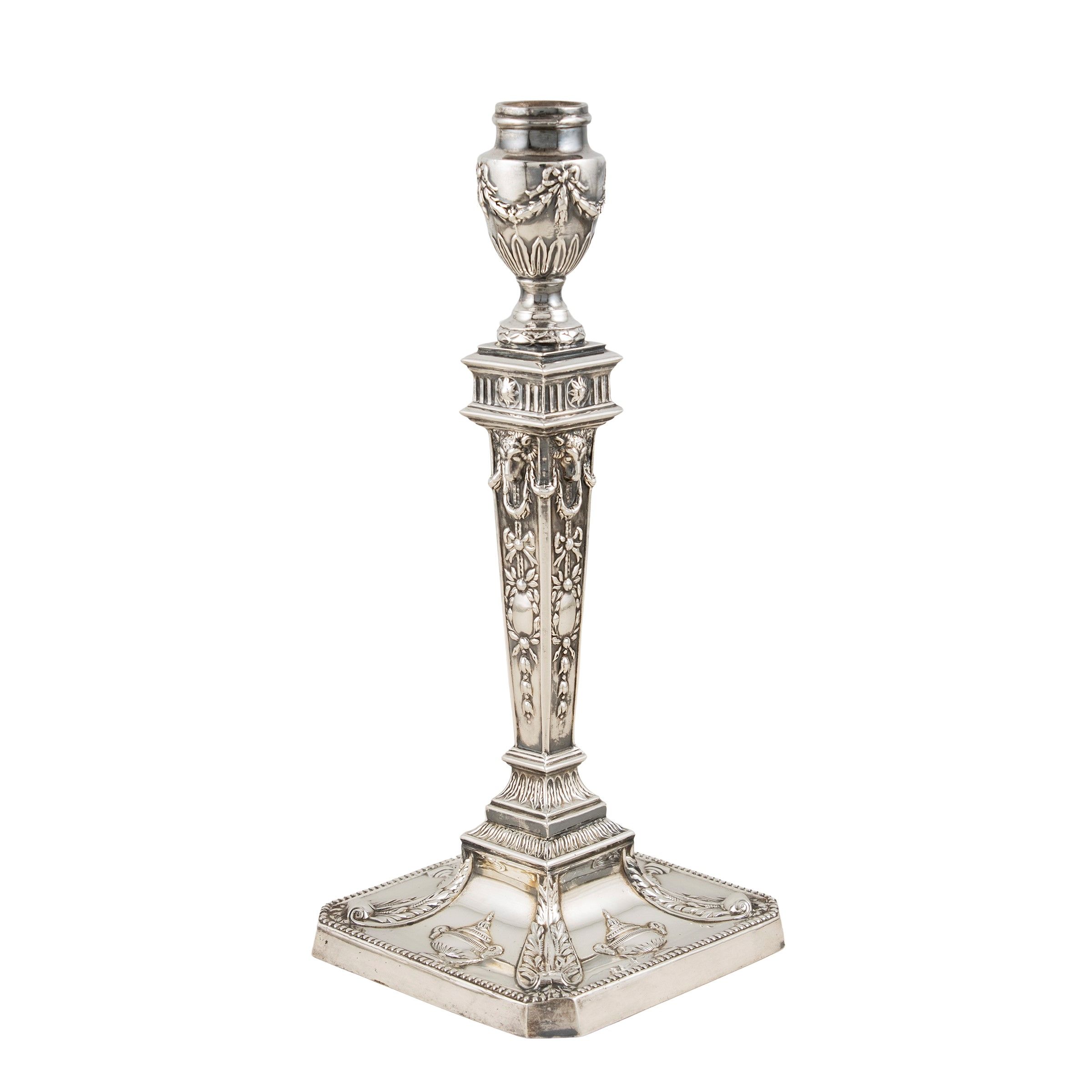 Sheffield, 1900 Orafo Alexander Clark Manufacturing Co., base squadrata e stelo decorati con motivi neoclassici, peso lordo 623 gr.