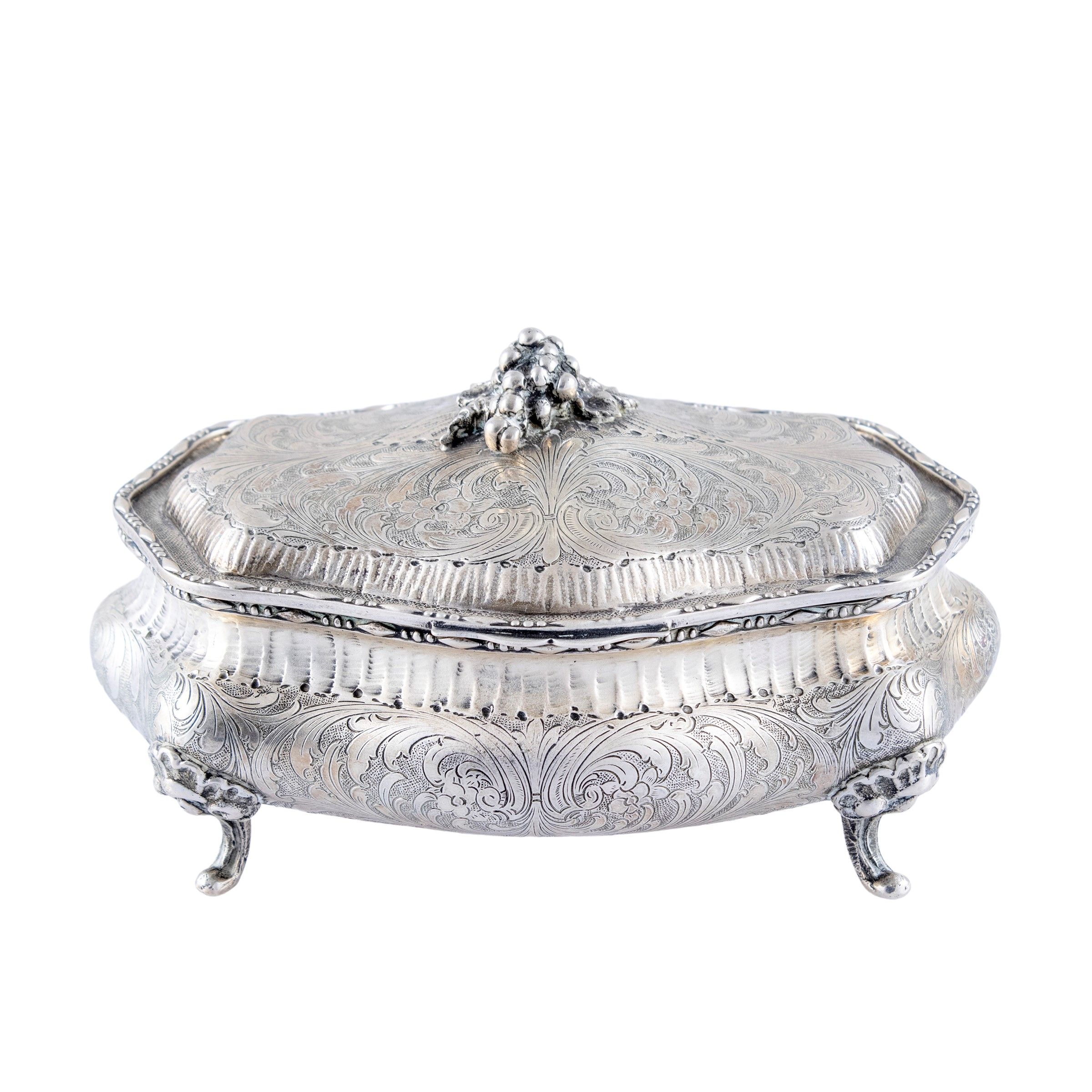 Italia, XX Sec. corpo sagomato, inciso con ricchi motivi di volute vegetali, presa del coperchio a foggia di grappolo d'uva, poggiante su quattro piedini a riccio, peso 545 gr.