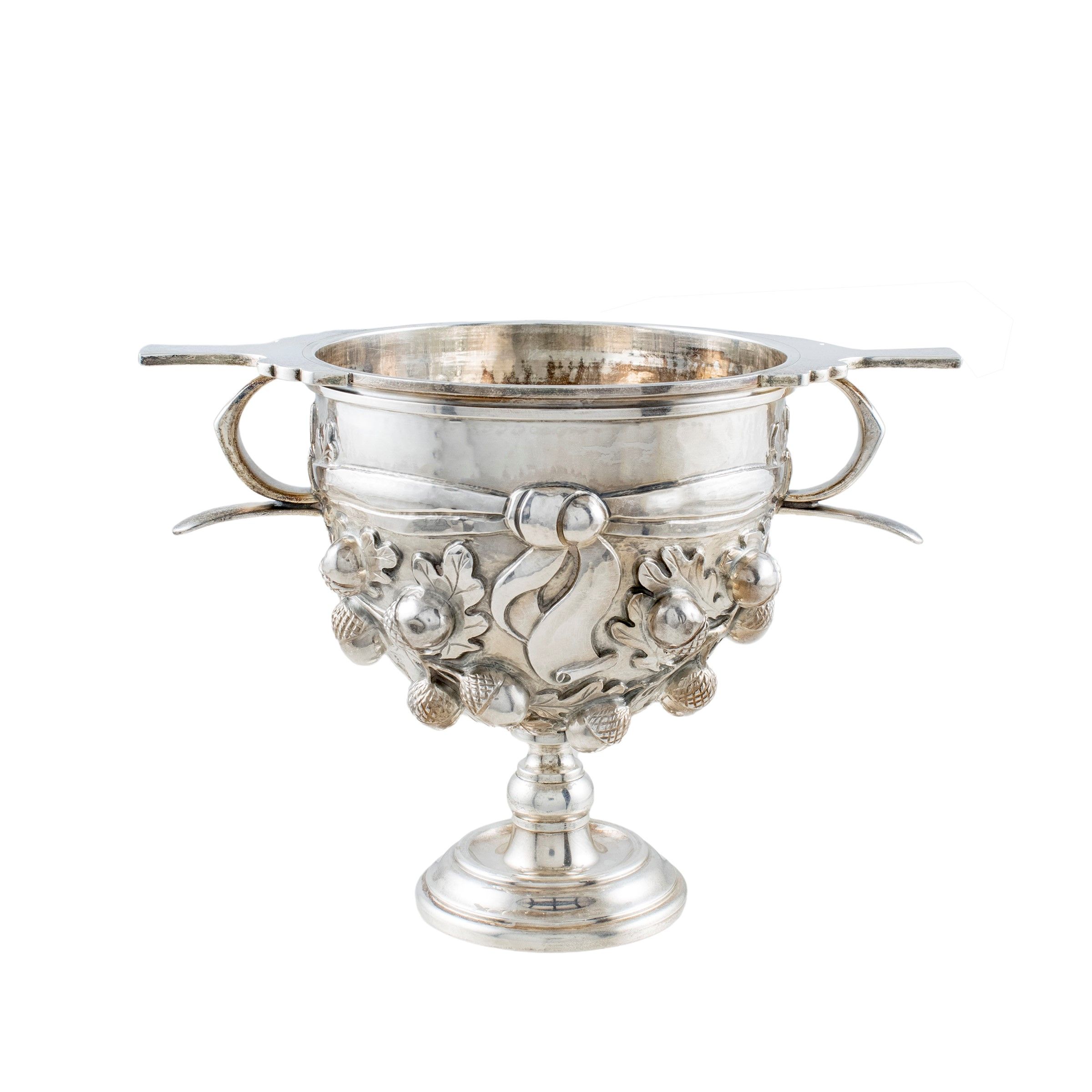 16x23x14 cm. Italia, XX Sec. decorata con motivi di foglie e ghiande in rilievo, firmata, peso 1170 gr. La coppa riprende i modelli del vasellame romano rinvenuto nel 1895 a Boscoreale ed attualmente conservato nel Museo del Louvre di Parigi