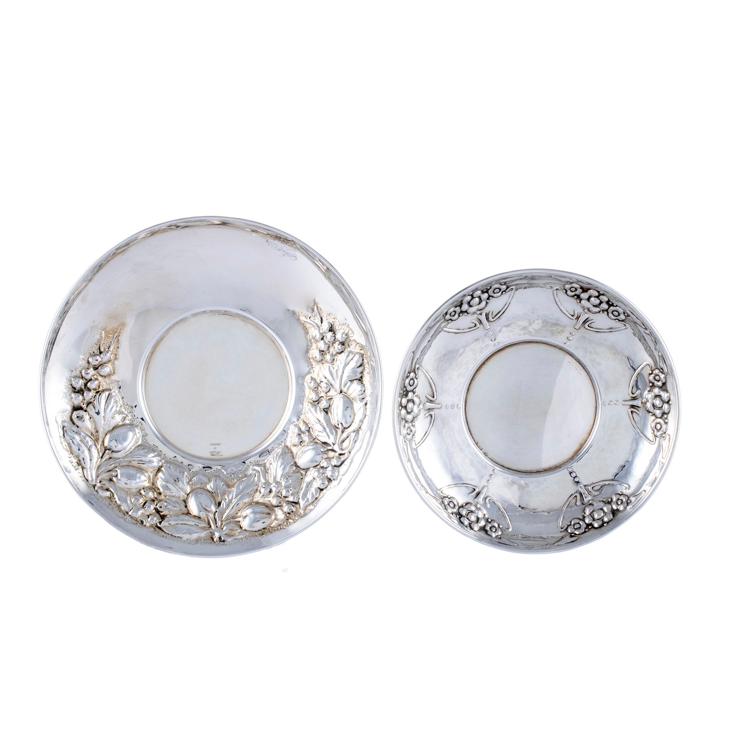 peso complessivo 467 gr. Italia, XX Sec. composto da : - un piatto centrotavola circolare in argento, corpo sbalzato con frutta e motivi vegetali, 4x24 cm. - un piatto centrotavola circolare in argento, corpo sbalzato con motivi floreali, 3,5x20,5 cm.