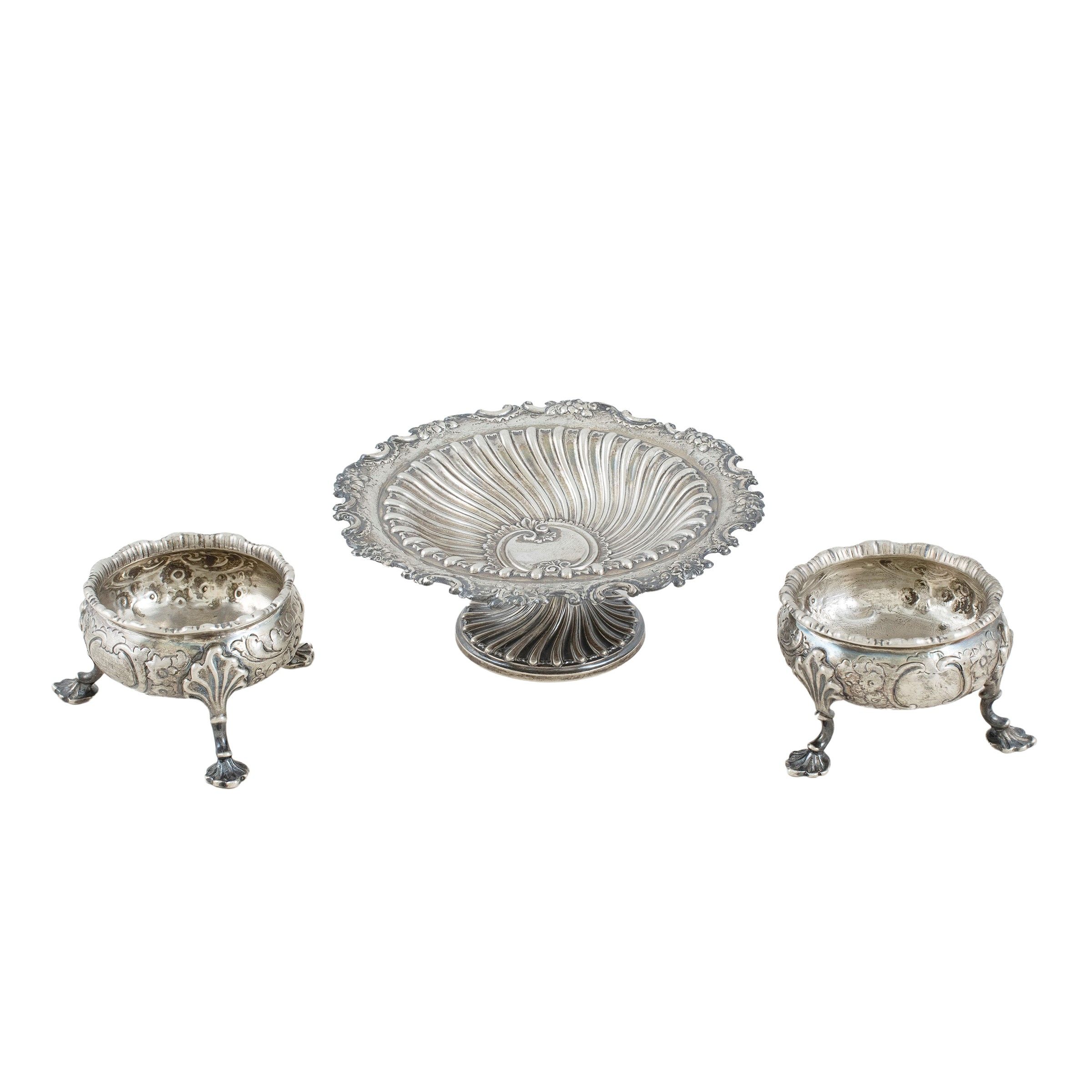 Inghilterra, XIX Sec. composto da: - una piccola alzata, Londra 1892, orafo Sibray, Hall & Co, corpo sbalzato e cesellato, profilo sagomato con motivi floreali, poggiante su base circolare, 5,5x15 cm. - una coppia di saliere, Londra 1848, corpi sbalzati e cesellati con motivi floreali, poggianti su tre piedini, h. 4,5 cm.