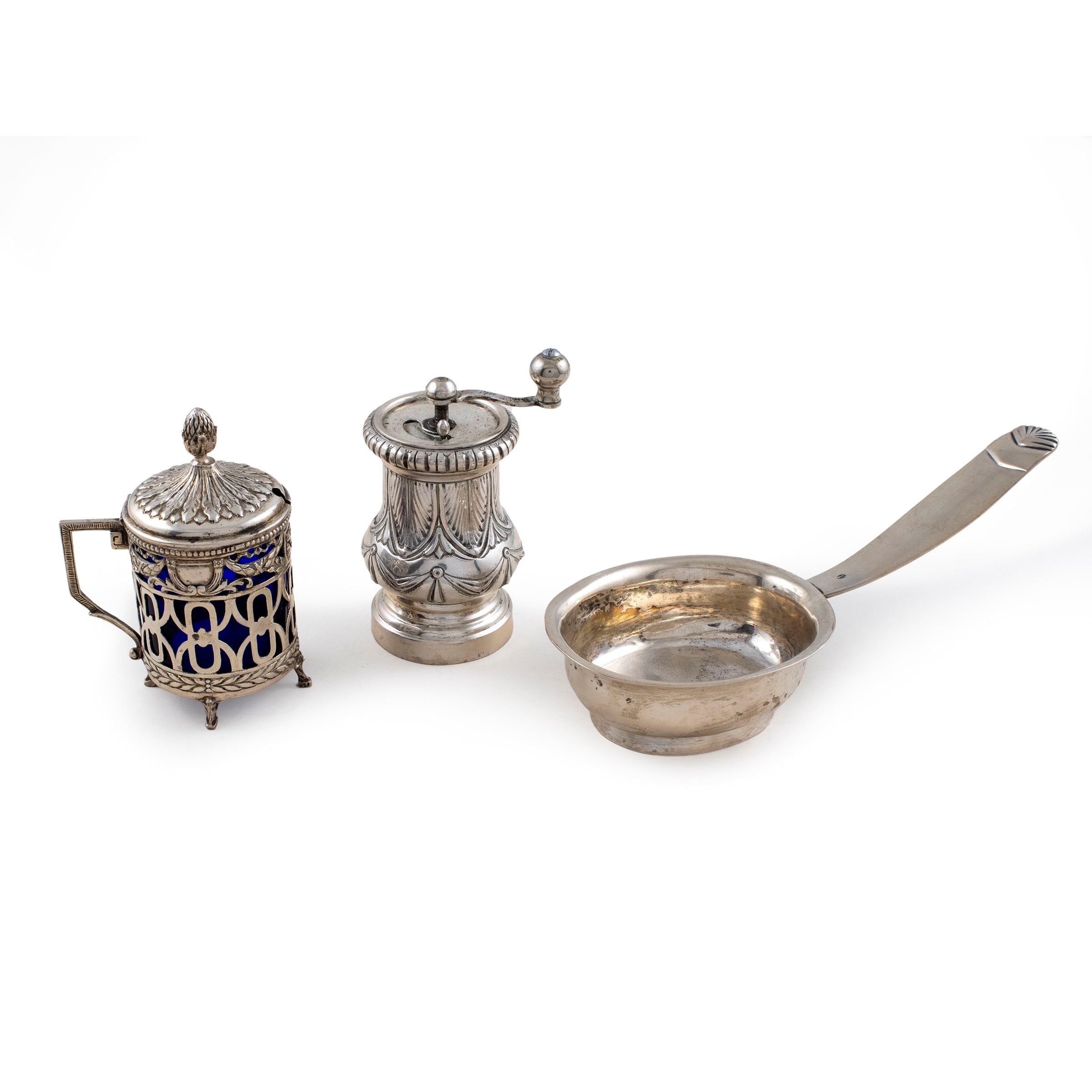 manifatture diverse composto da: - una mostardiera in argento, interno in vetro opalino blu, h. 11 cm. - un macina pepe in argento, h. 11 cm. - un cestino con manico in argento, 8x20x8 cm.