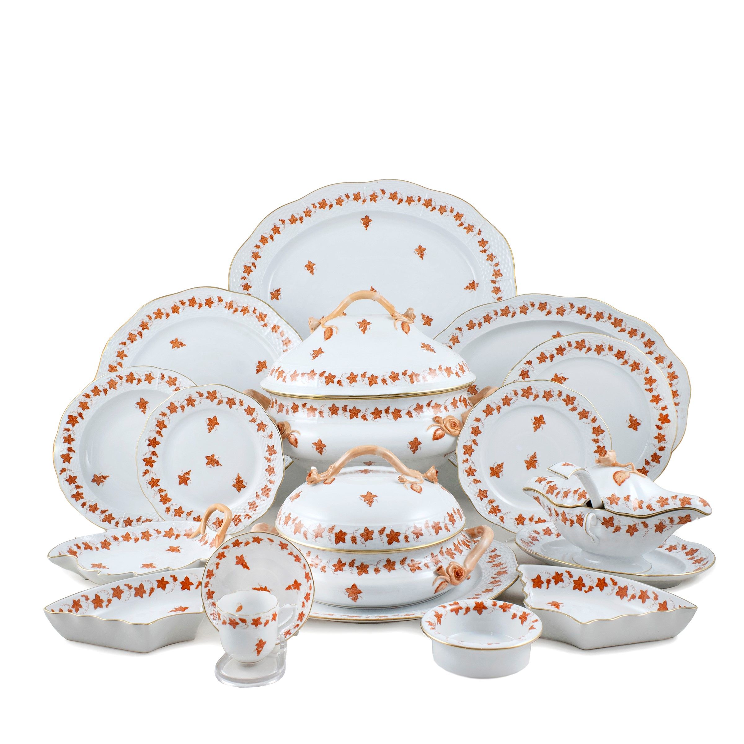 Ungheria, XX Sec. decoro 'Foglie di vite e grappoli d'uva ruggine', in porcellana policroma su fondo bianco, bordo Ozier con profilo dorato, marchio della produzione. Composto da: 24 piatti piani d. 25,5 cm. 12 piatti fondi d. 24,5 cm. 24 piatti da frutta d. 21 cm. una zuppiera 28x37x25 cm. una legumiera 16x29x25 cm. una insalatiera 9,5x26x26 cm. 3 piatti ovali da portata misura massima 46,5x35,5 cm. 3 piatti circolari misura massima d. 37 cm. una salsiera con colino 9,5x25x21 cm. 2 foglie 24x20 cm. 12 tazzine da caffè h. 6 cm. con 12 piattini d. 11 cm. 5 raviere 3,5x20x14 cm. 1 posacenere 4x12 cm.