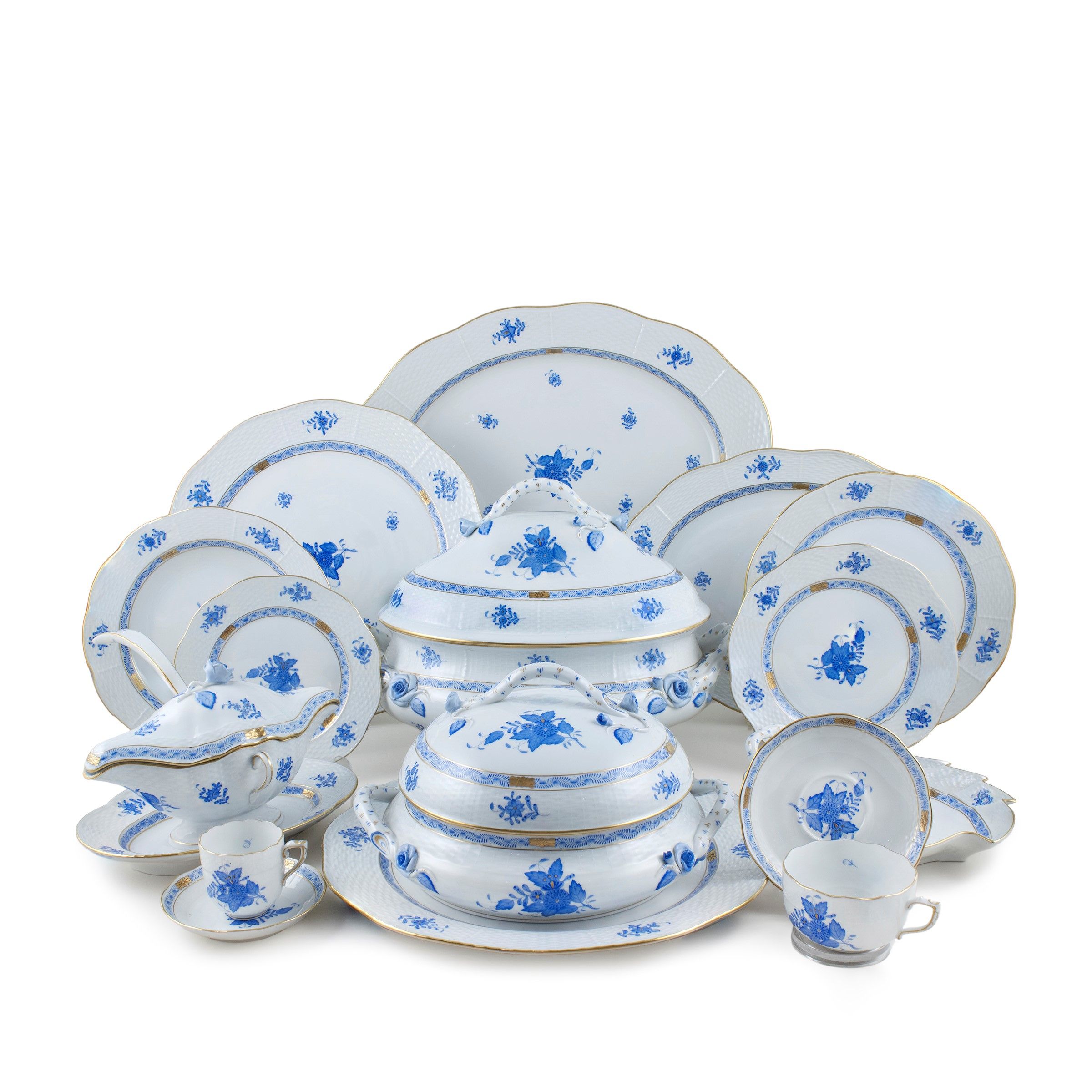 Ungheria, XX Sec. decoro 'Apponyi blu', in porcellana policroma su fondo bianco, bordo Ozier e profilo dorato, marchio della produzione. Composto da: 24 piatti piani d. 25,5 cm. 12 piatti fondi d. 24,5 cm. 24 piatti da frutta d. 19 cm. 12 piatti da dolce d. 18,5 cm. una zuppiera 28x37x25 cm. una legumiera 16x29x25 cm. 3 piatti ovali da portata misura massima 46,5x35,5 cm. 2 piatti circolari d. 35 cm. una salsiera con colino 9,5x25x21 cm. 2 foglie 24x20 cm. 12 tazzine da the h. 5 con 12 piattini d. 13,5 cm. 12 tazzine da caffè h. 6 cm. con 12 piattini d. 11 cm.