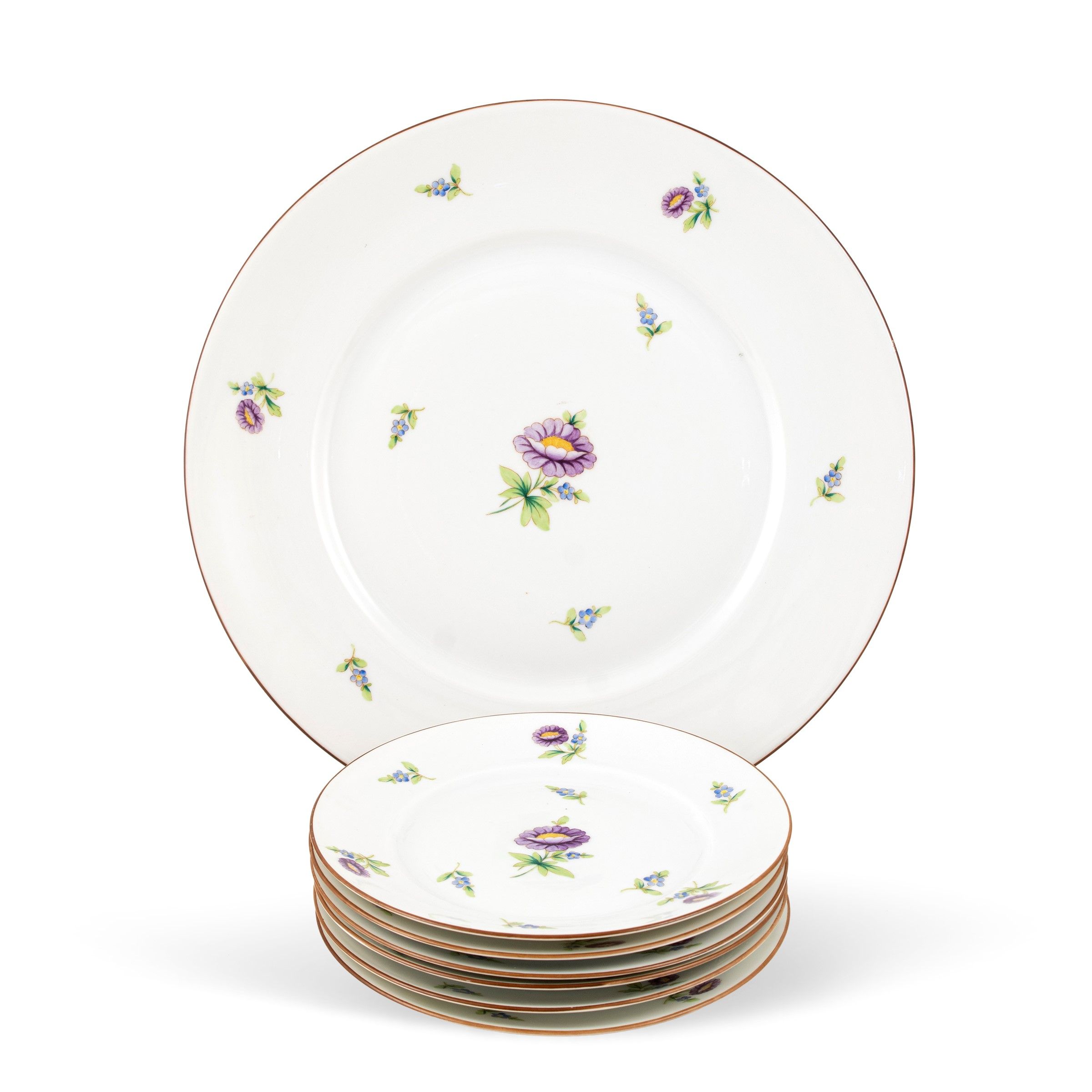 Ungheria, XX Sec. decoro 'Purple Aster', in porcellana policroma su fondo bianco, marchio della produzione. Composto da: 1 piatto da portata d. 26 cm. 6 piattini d. 15 cm.