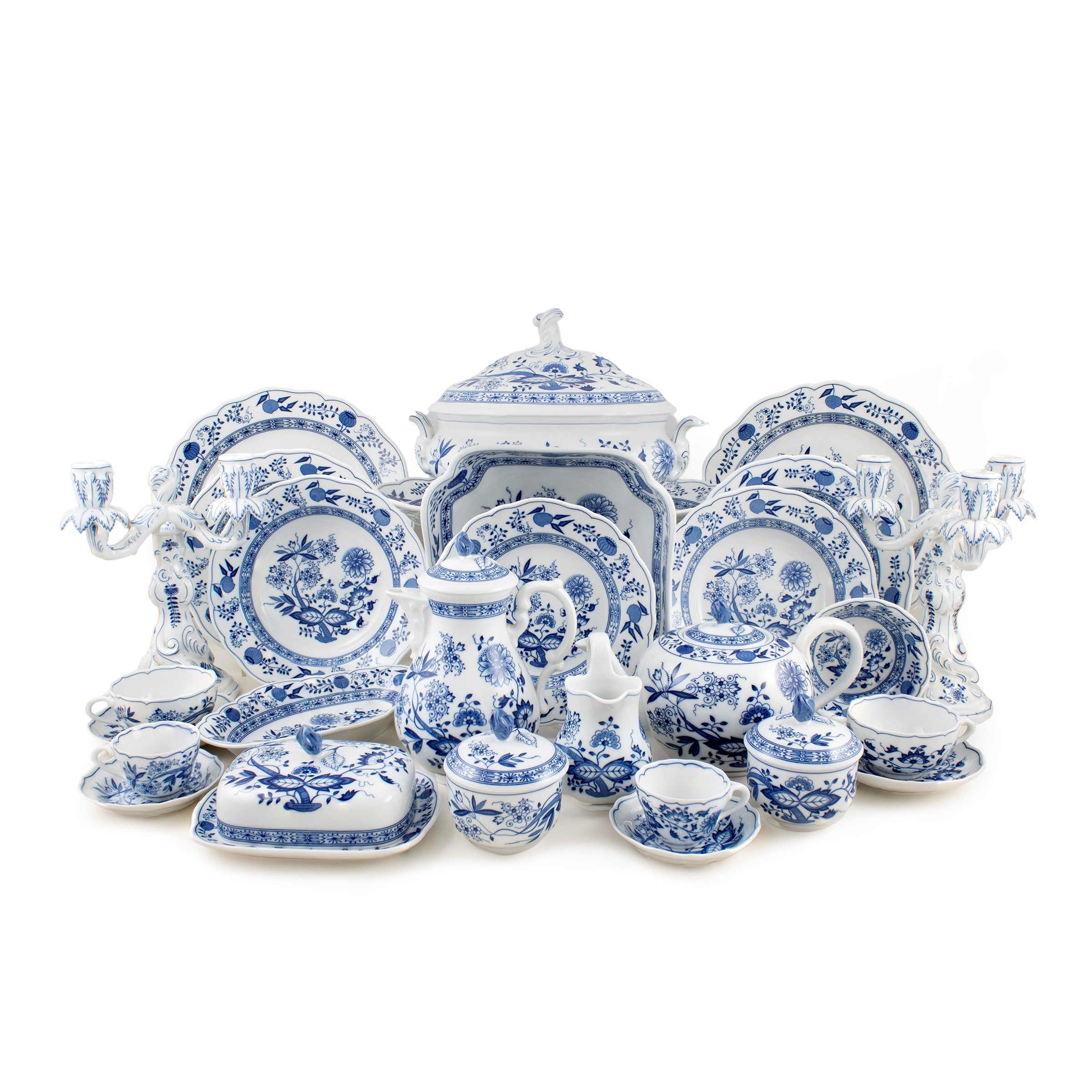 Germania, XX Sec. decoro 'Cipolla blu', in porcellana blu su fondo bianco, marchio della produzione. Composto da: 36 piatti piani d. 25 cm. 18 piatti fondi d. 23 cm. 35 piatti da frutta d. 21 cm. 24 piatti da dolce d. 19 cm. una zuppiera 26x37x24 cm. un piatto ovale da portata 44x30 cm. un piatto ovale da portata 60x25 cm. 3 piatti circolari d. 33 cm. 2 insalatiere 11x25x25 cm. una raviera 25x15 cm. 12 coppette d. 13 cm. un portaburro 8x17x15 cm. una caffettiera h. 21 cm. una teiera h. 14 cm. 4 zuccheriere h. 10 cm. due lattiere h. 13 cm. 12 tazzine da the h. 5 cm. con 11 piattini d. 14 cm. 12 tazzine da caffè h. 5 cm. con 12 piattini d. 11 cm. una coppia di candelabri a tre luci h. 26 cm.