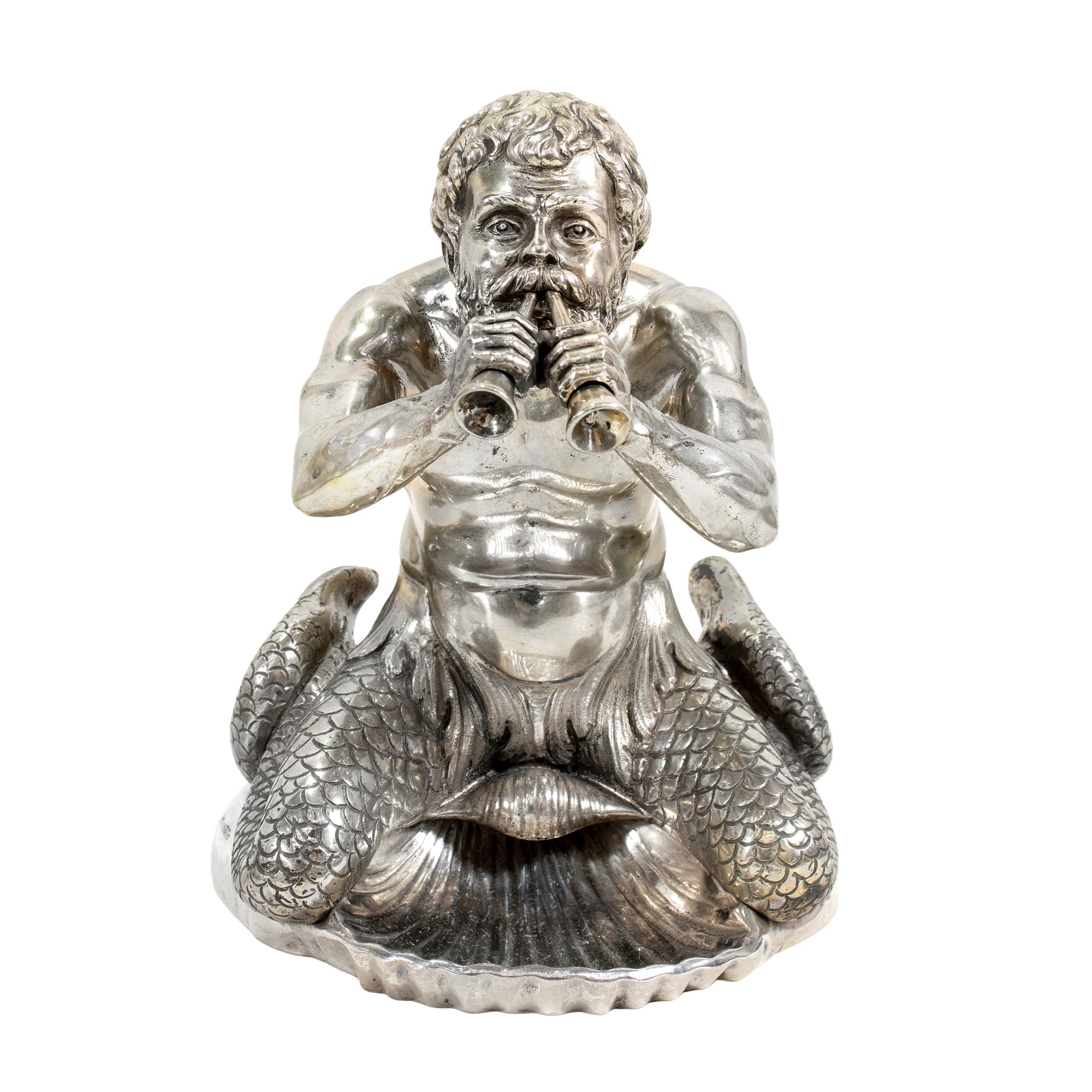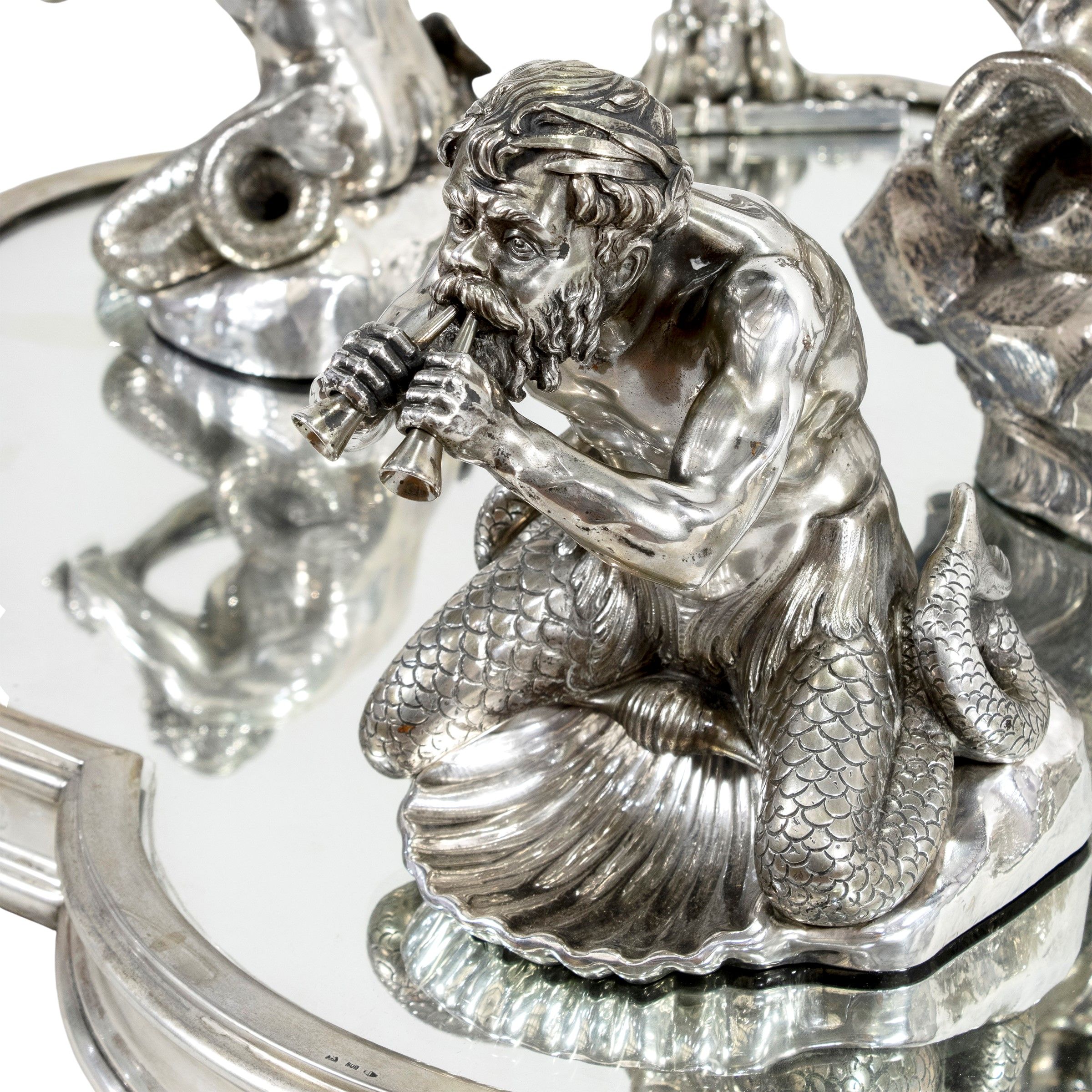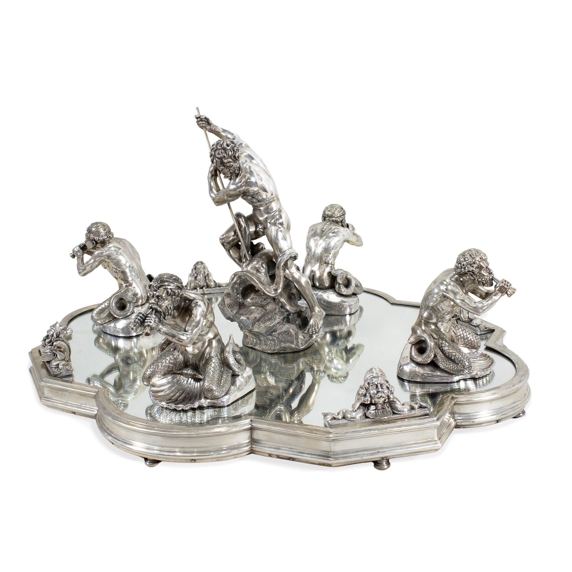 8x98x80 cm. Italia, bollo Fascio, anni 30-40 composto da un vassoio a specchio dal bordo mistilineo poggiante su otto piedini e da nove sculture mitologiche; al centro una scultura raffigurante Nettuno su uno scoglio in lotta con una piovra, h. 45 cm. ai lati quattro sculture raffiguranti Tritoni, h. 22 cm. cadauna e quattro gruppi raffiguranti un mascherone tra due delfini, 8x15x4 cm. cadauno. Peso netto 16000 gr. circa Provenienza: Roma, Collezione Petochi Bibliografia: Dawn of a New York. La New York World's Fair, 1939-1940