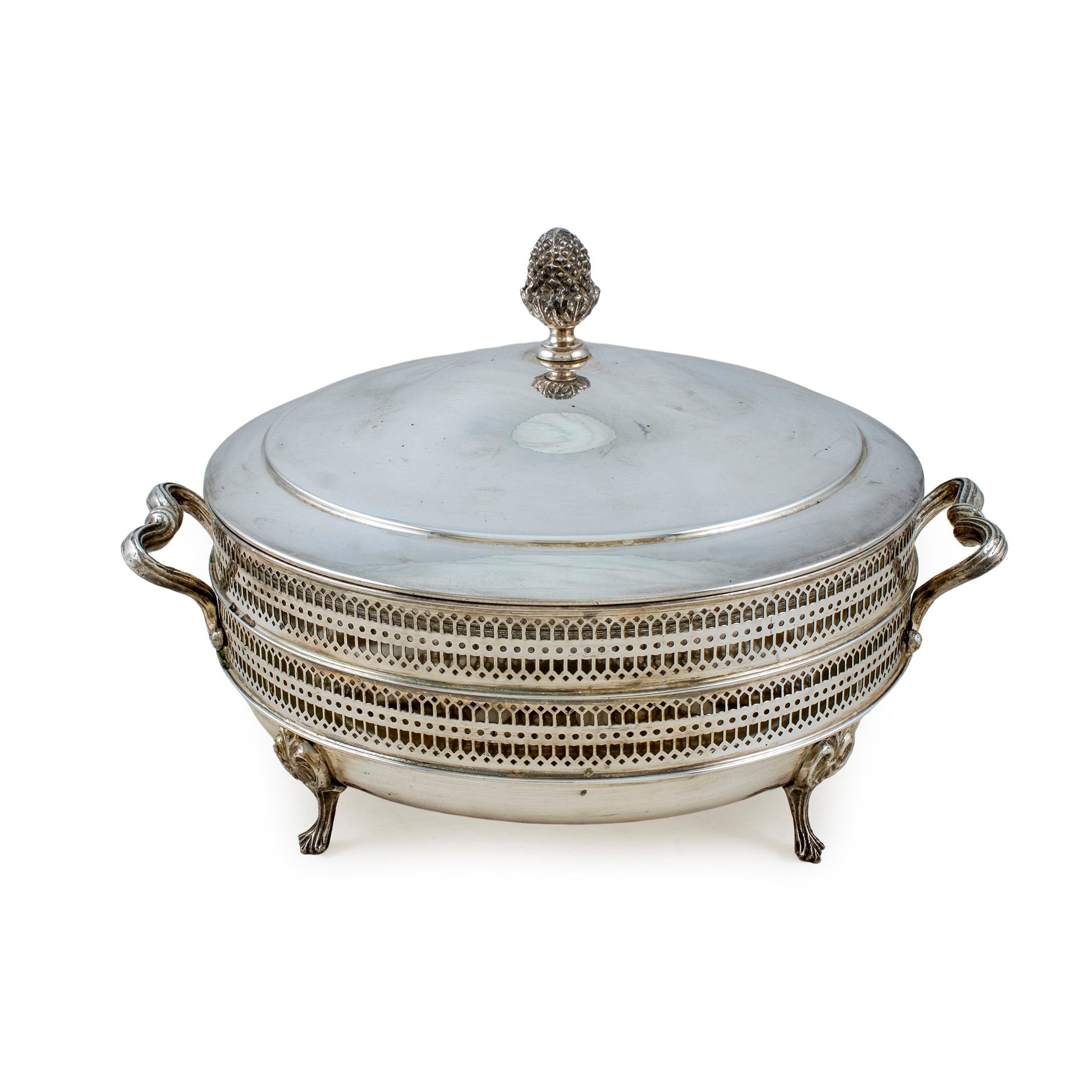 XX Sec. forma circolare a due manici, fascia traforata, poggiante su quattro piedini a voluta, presa del coperchio a pigna, interno in vetro