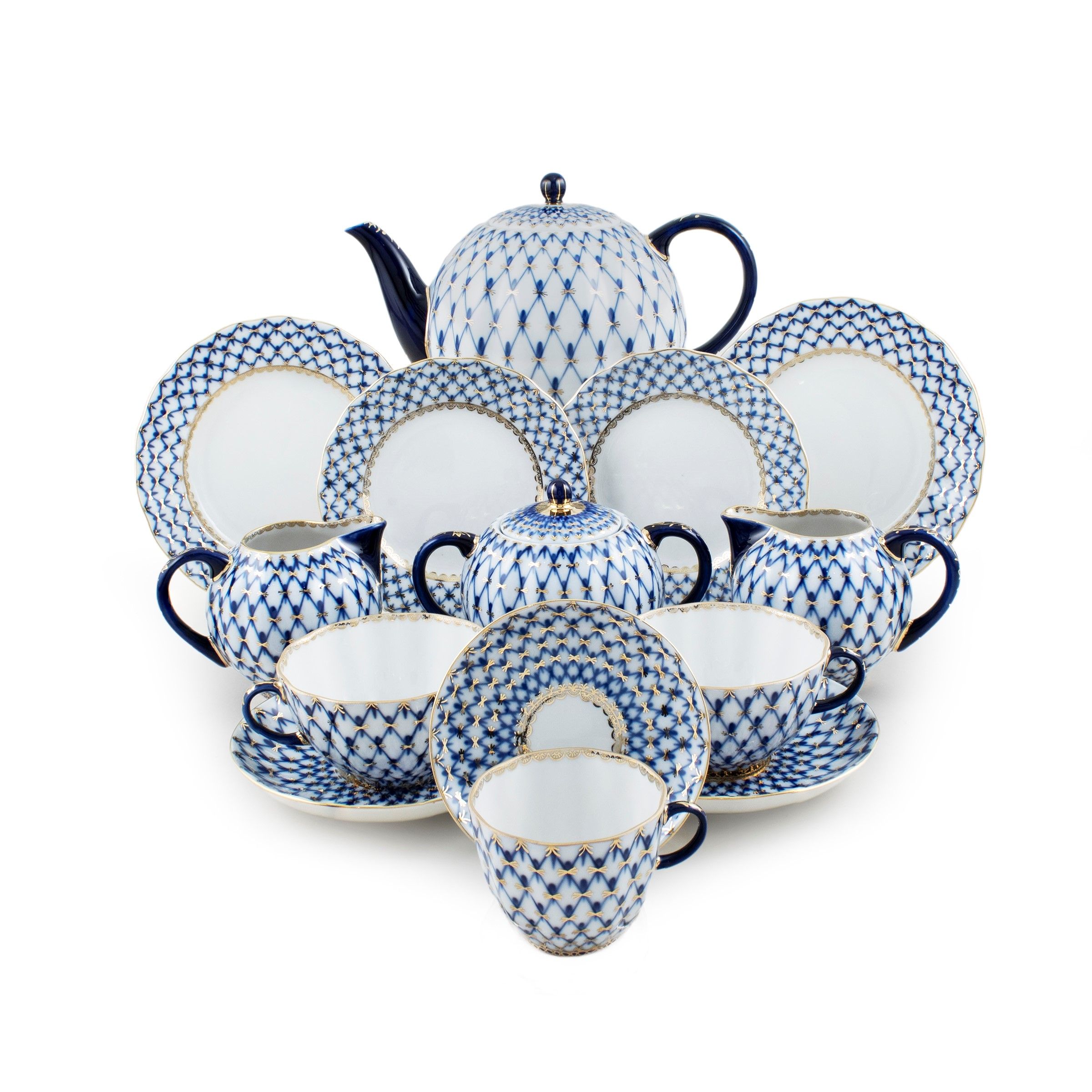 Russia, XX Sec. modello 'Tulipano decoro rete cobalto' in porcellana blu cobalto e oro su fondo bianco, marchio della produzione. Composto da: una teiera h. 19 cm. una zuccheriera h. 10 cm. 2 lattiere h. 8 cm. 12 tazze da the h. 6 cm. con 9 piattini d. 15 cm. 7 tazze da caffè h. 6 con 7 piattini d. 11,5 cm. 12 piattini da dolce d. 18 cm. 11 sottopiatti d. 15 cm.