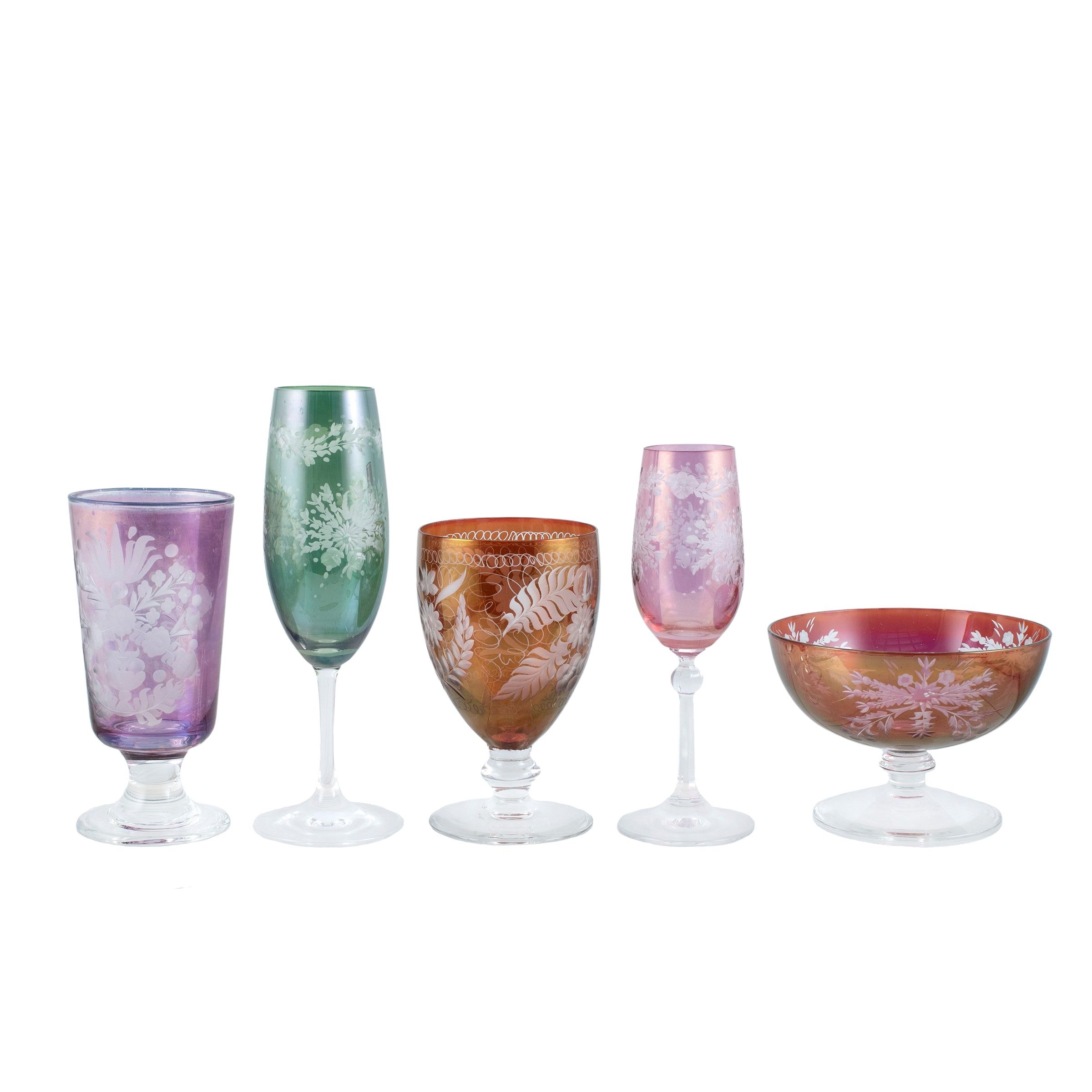metà XX Sec. in vetro inciso, molato e colorato, composto da: 36 bicchieri di fogge e misure diverse h. massima 19,5 cm. 16 coppe h. 8 cm.