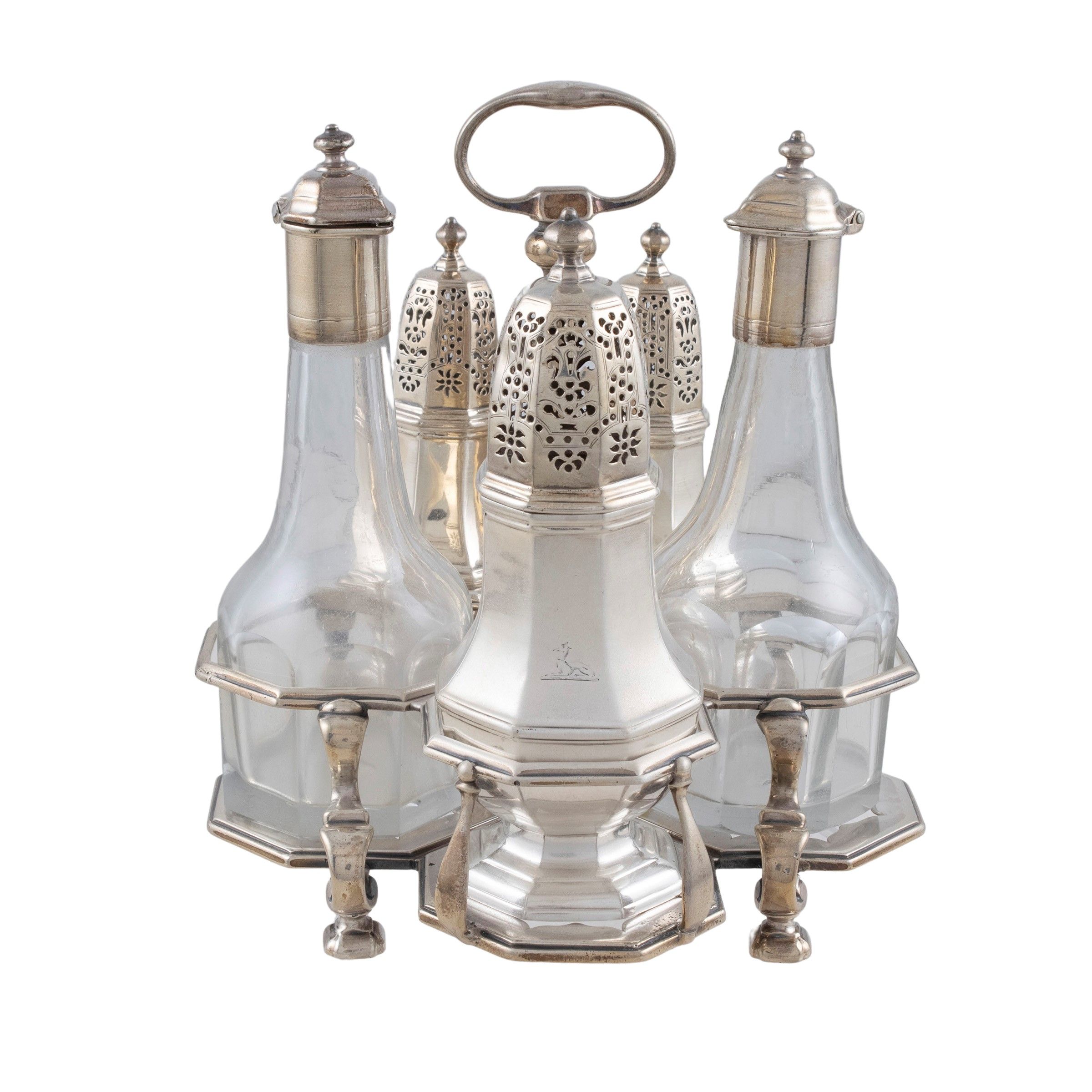 Inghilterra, XVIII-XIX Sec. struttura in argento poggiante su quattro piedini quadrati, completa di tre ampolle in argento e due ampolle in cristallo molato con tappi in argento, peso netto 1200 gr.