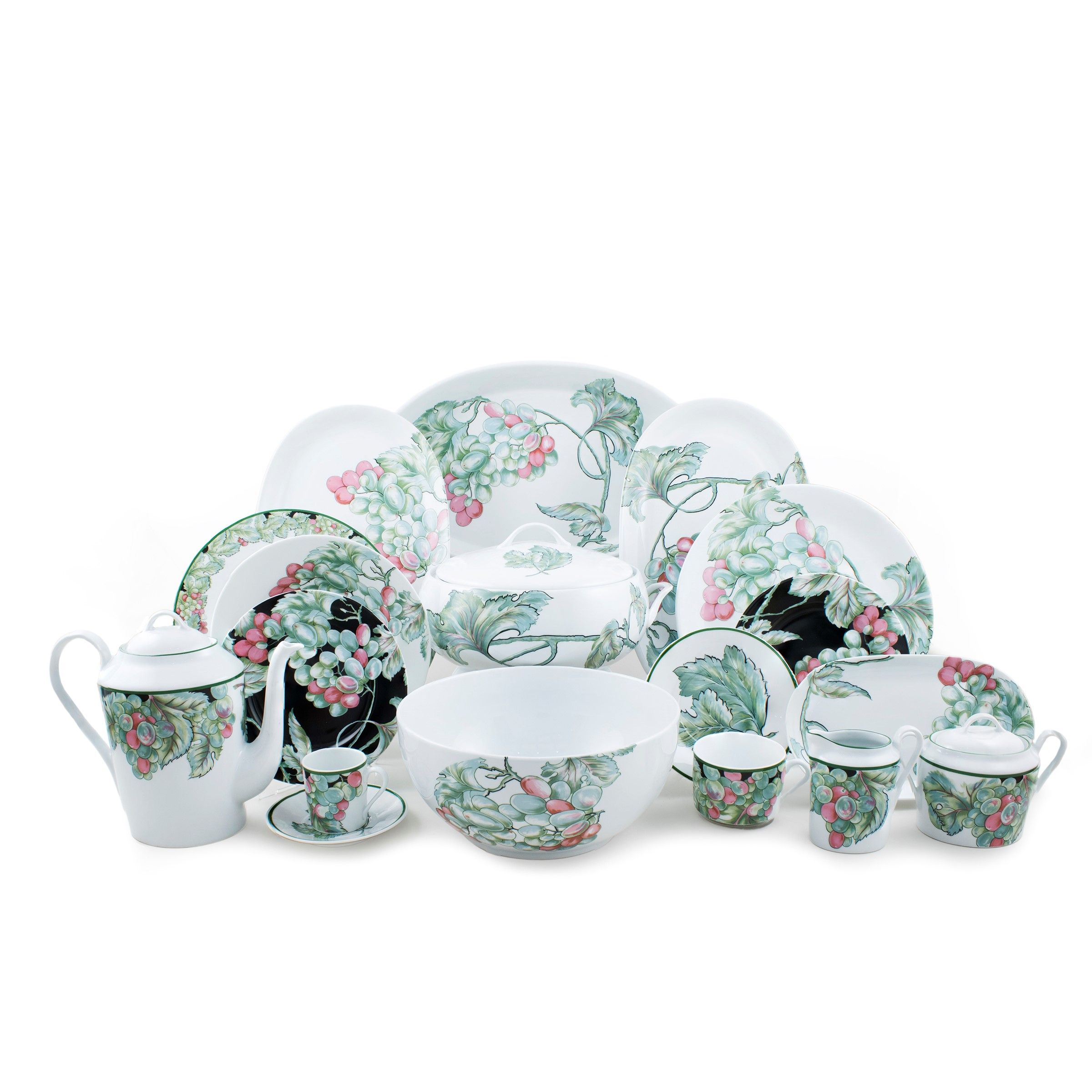 Francia, XX Sec. decoro 'Vendages', in porcellana policroma su fondo bianco e nero, marchio della produzione. Composto da: 12 piatti piani d. 25,5 cm. 14 piatti fondi d. 22 cm. 24 piatti da frutta d. 21 cm. una zuppiera 15x32x24 cm. 2 piatti ovale da portata 38x24 cm. 2 piatti circolari d. 28 cm. 2 insalatiere 9x25 cm. - 11,5x23,5 cm. 2 raviere 23,5x13 cm. una pirofila ovale 6x41x26 cm. una caffettiera h. 20 cm. 2 zuccheriere h. 9,5 cm. una lattiera h. 9,5 cm. 12 tazzine da the h. 5,5 cm. con 12 piattini d. 14,5 cm. 12 tazzine da caffè h. 6 cm. con 12 piattini d. 12,5 cm.