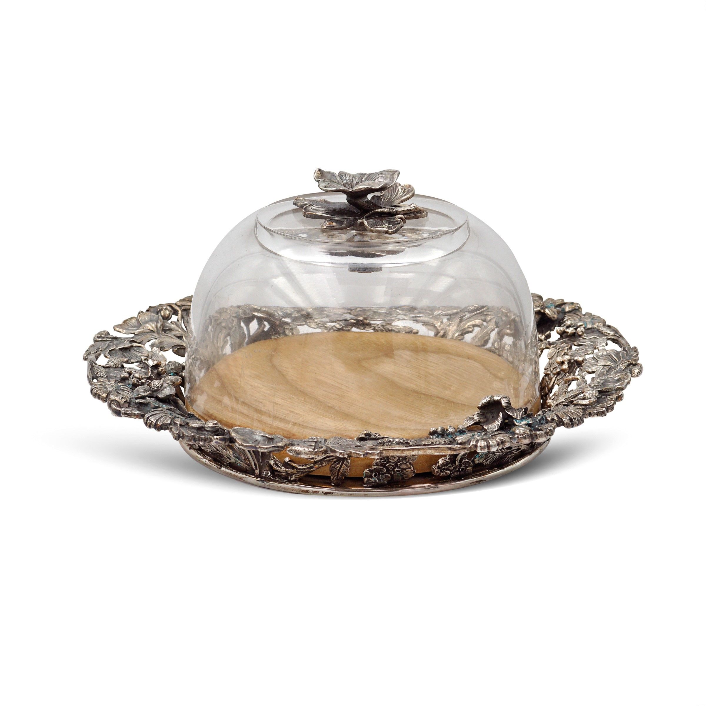 Italia, XX Sec. piatto circolare traforato e cesellato con motivi floreali e vegetali, campana in vetro poggiante su base in legno, presa in argento a foggia di fiore, peso 325 gr.