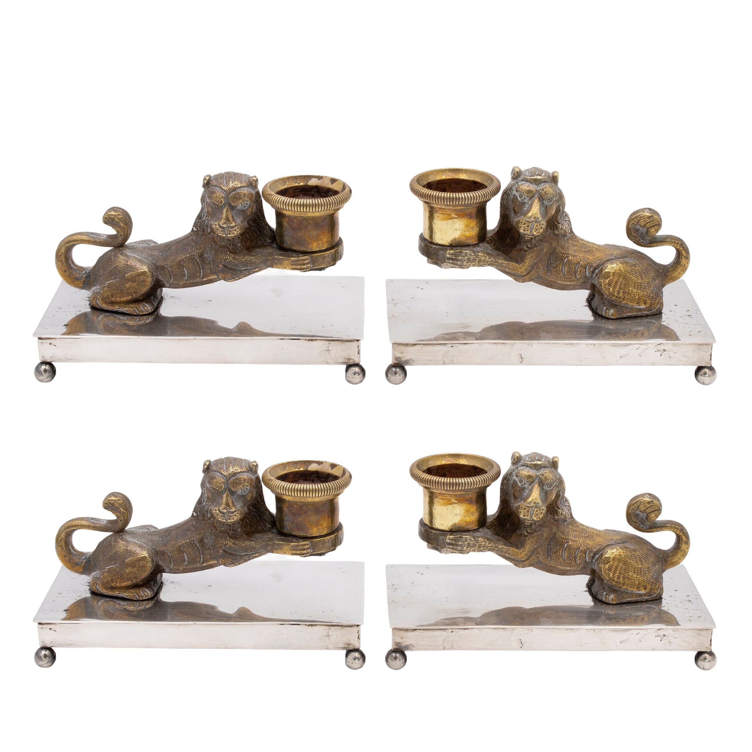 XIX Sec. sculture in bronzo dorato e cesellato a raffigurare leoni nell'atto di sorreggere un portacandela, basi rettangolari in argento poggiante su quattro piedini sferici, peso lordo 1764 gr.