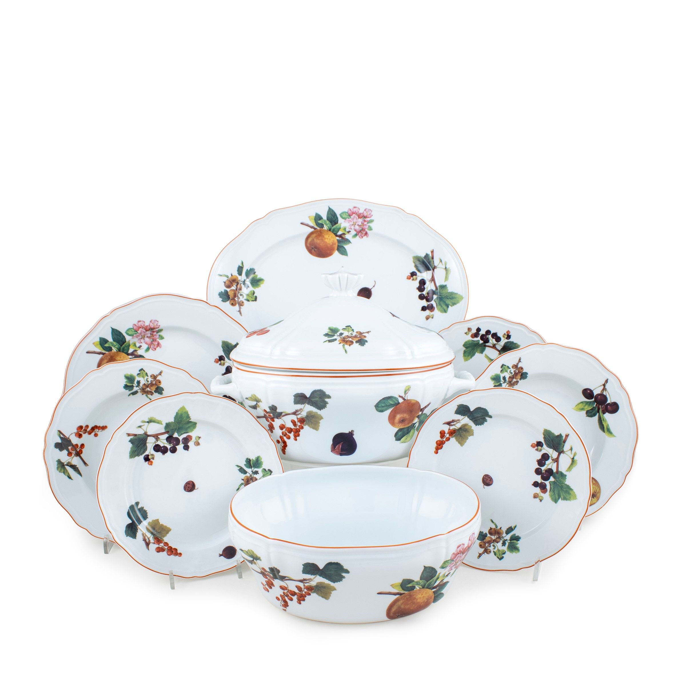 Italia, XX Sec. decoro 'Tione Frutti Antico Doccia', in porcellana policroma su fondo bianco, marchio della produzione. Composto da: 24 piatti piani d. 24 cm. 12 piatti fondi d. 23,5 cm. 12 piatti da frutta d. 20,5 cm. una zuppiera 23,5x33x21,5 cm. una insalatiera 10,5x25,5x20 cm. un piatto ovale da portata 39,5x30 cm. un piatto circolare da portata d. 30,5 cm.