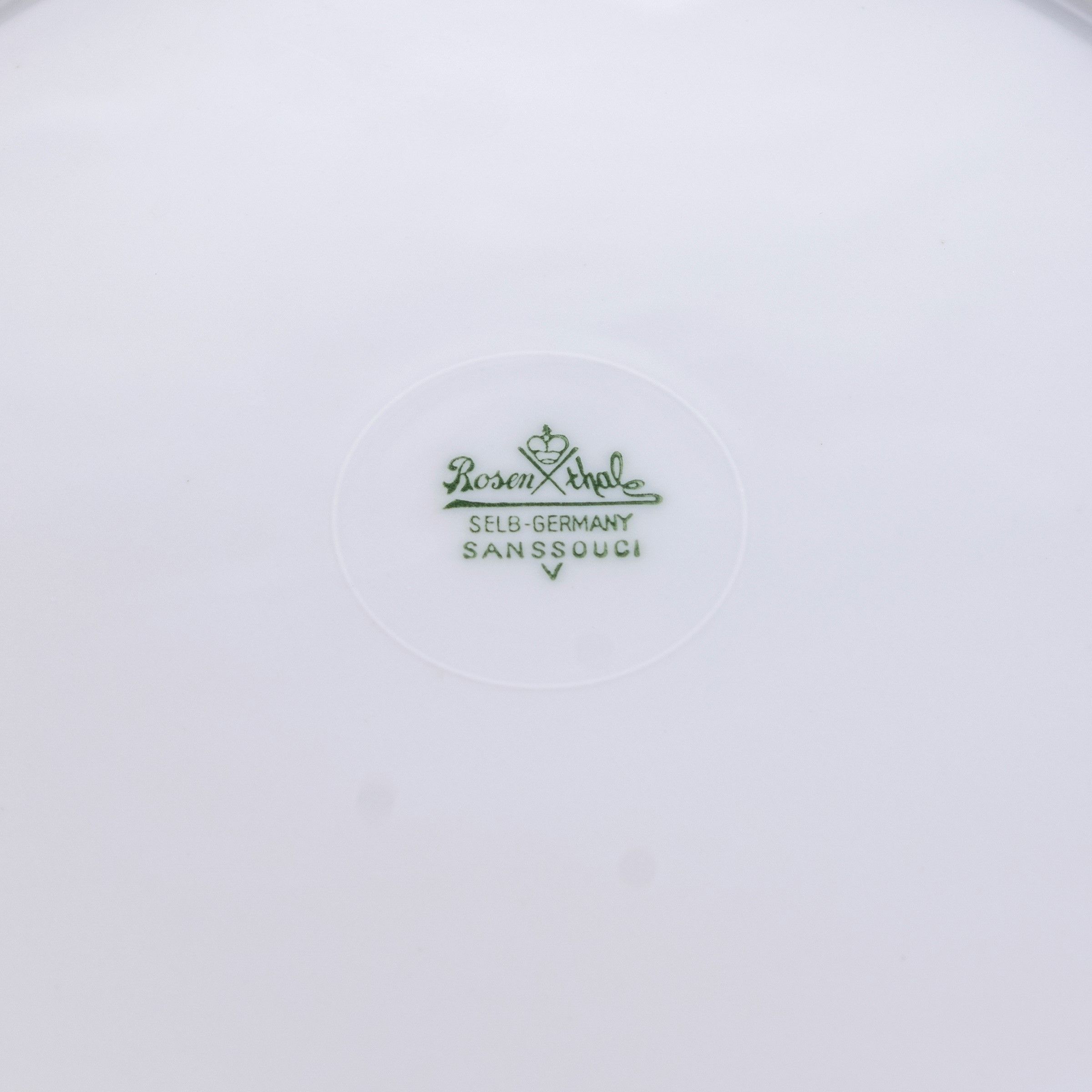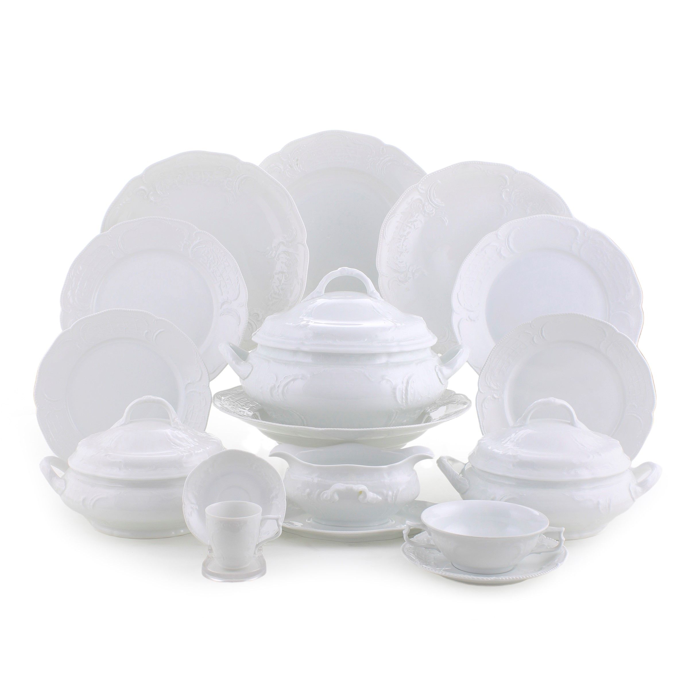 Germania, XX Sec. modello 'Sanssouci', in porcellana bianca con decoro in rilievo, marchio della produzione. Composto da: 36 piatti piani d. 25 cm. 14 piatti fondi d. 25 cm. 36 piatti da frutta d. 22 cm. 14 piattini da pane d. 16 cm. una zuppiera 20x32x26 cm. 2 legumiere 15x26x22 cm. 2 alzate tonde 6x29,5 cm. una salsiera 10x25x16 cm. 2 raviere 26x16 cm. 3 piatti ovali da portata 33x21 cm. 4 piatti ovali da portata 39x24 cm. 2 piatti tondi da portata d. 33 cm. 2 insalatiere 28x28 cm. 18 tazze da brodo h. 5 cm. con 18 piattini d. 17 cm. 18 tazzine da caffè h. 6 cm. con 18 piattini d. 11,5 cm.