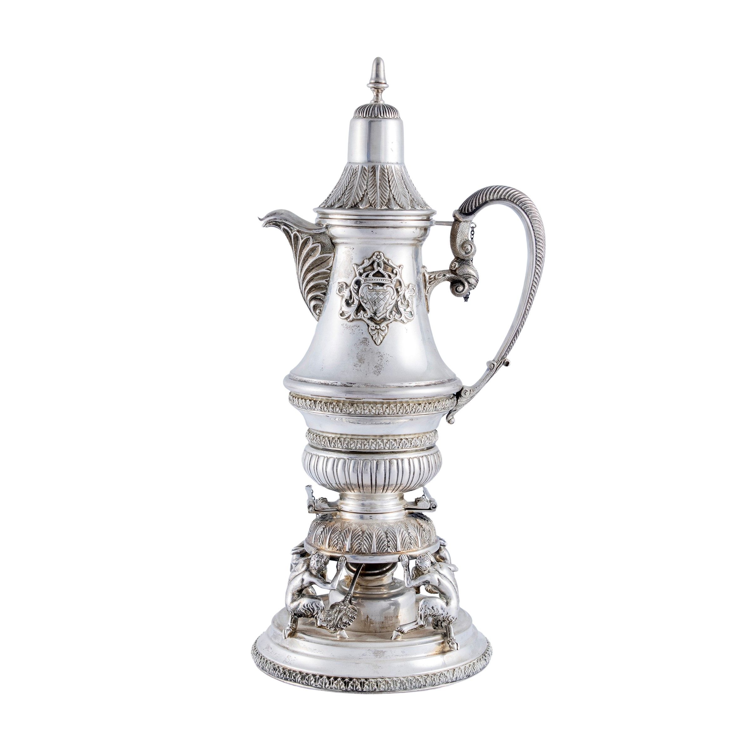 Italia, XX Sec. corpo baccellato e cesellato con volute vegetali centrato da uno stemma araldico, base con scaldino cesellato e decorato con quattro fauni e palmette vegetali, peso 2068 gr.