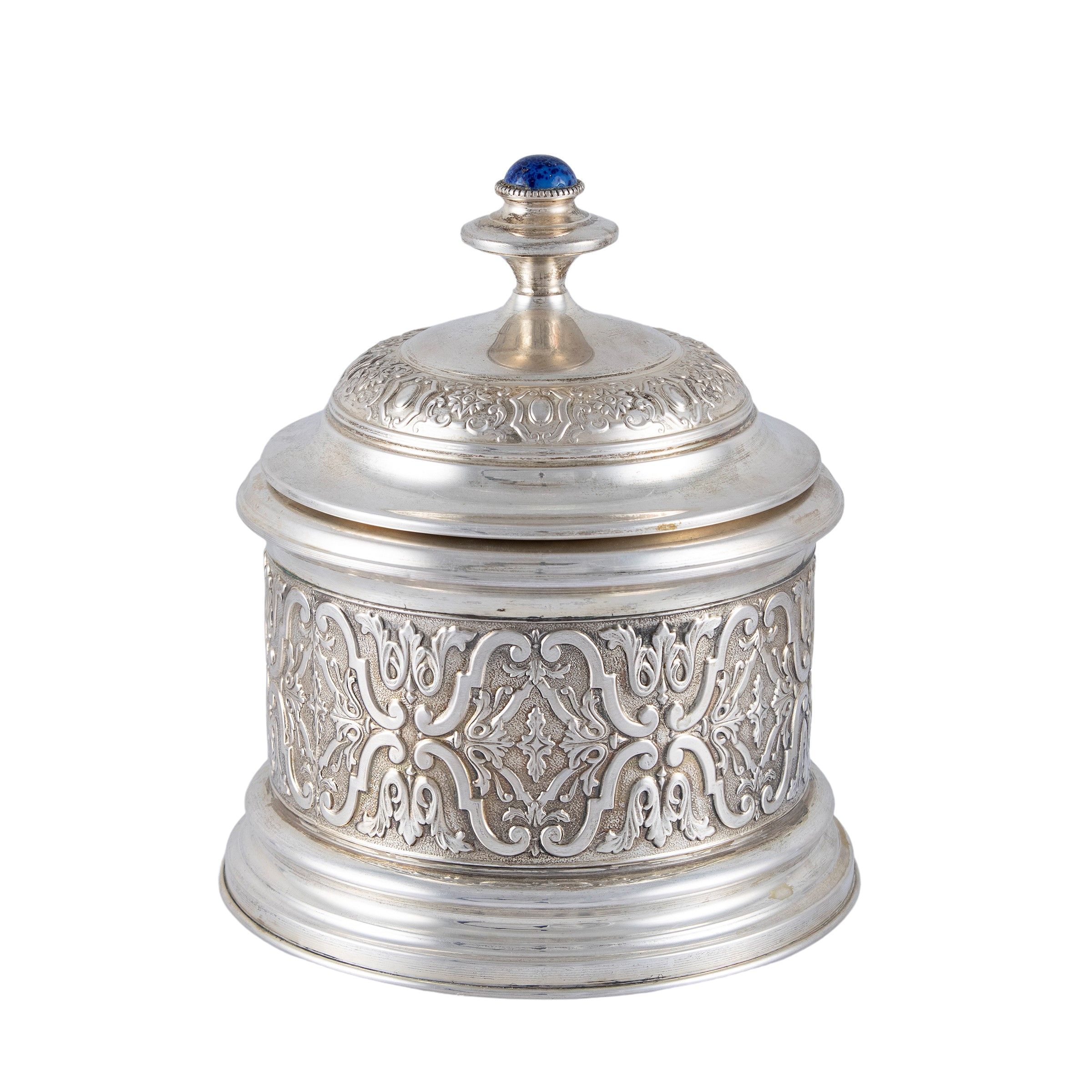 Italia, XX Sec. corpo sbalzato e cesellato con motivi vegetali e di volute, presa del coperchio con terminale in lapislazzulo cabochon, interno in vetro opalino blu, peso lordo 725 gr.
