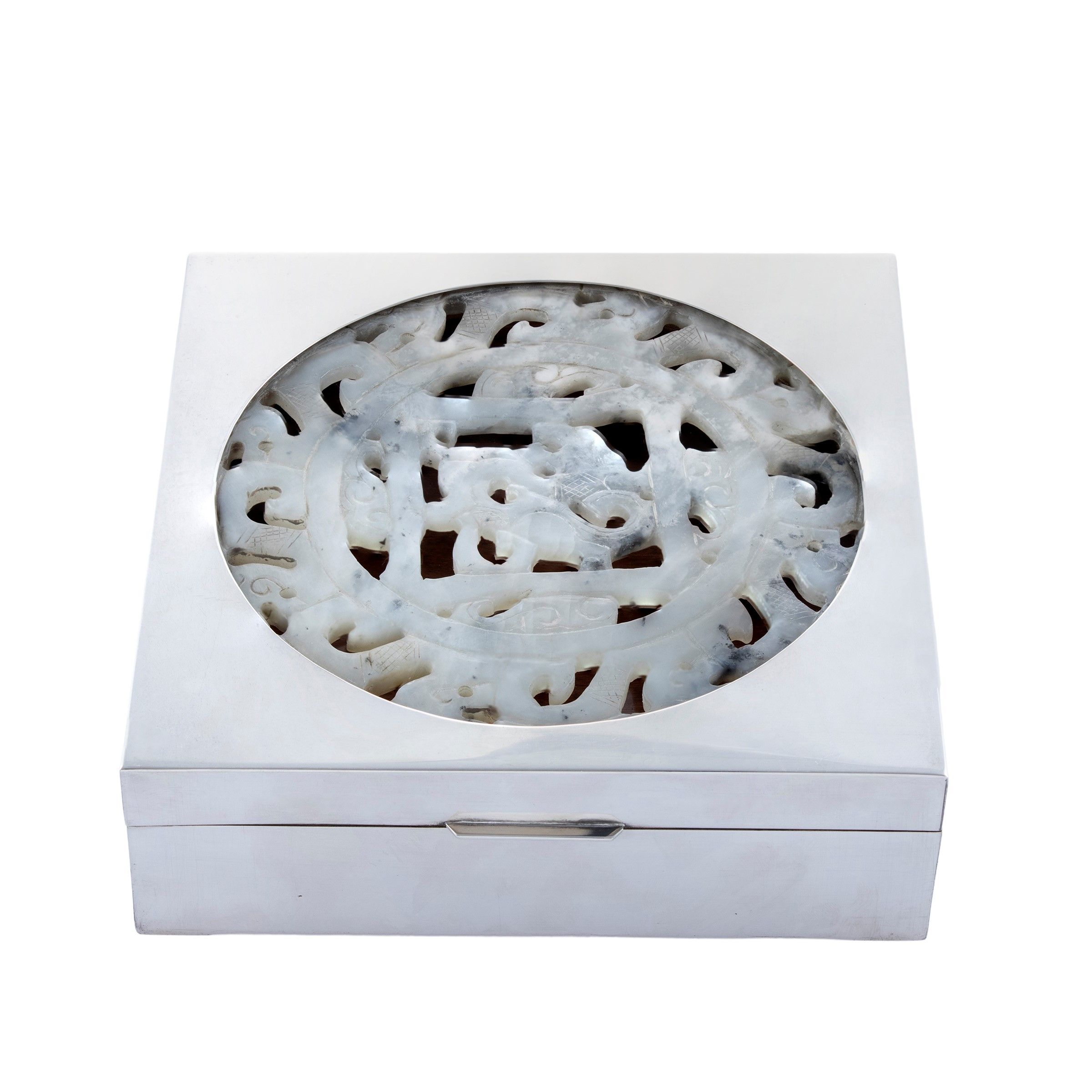 Italia, XX Sec. orafo Cristiana Dabbene, Milano, forma quadrata ed interno in legno, coperchio centrato da una placca in giada traforata ed incisa con motivi orientali, peso lordo 668 gr.