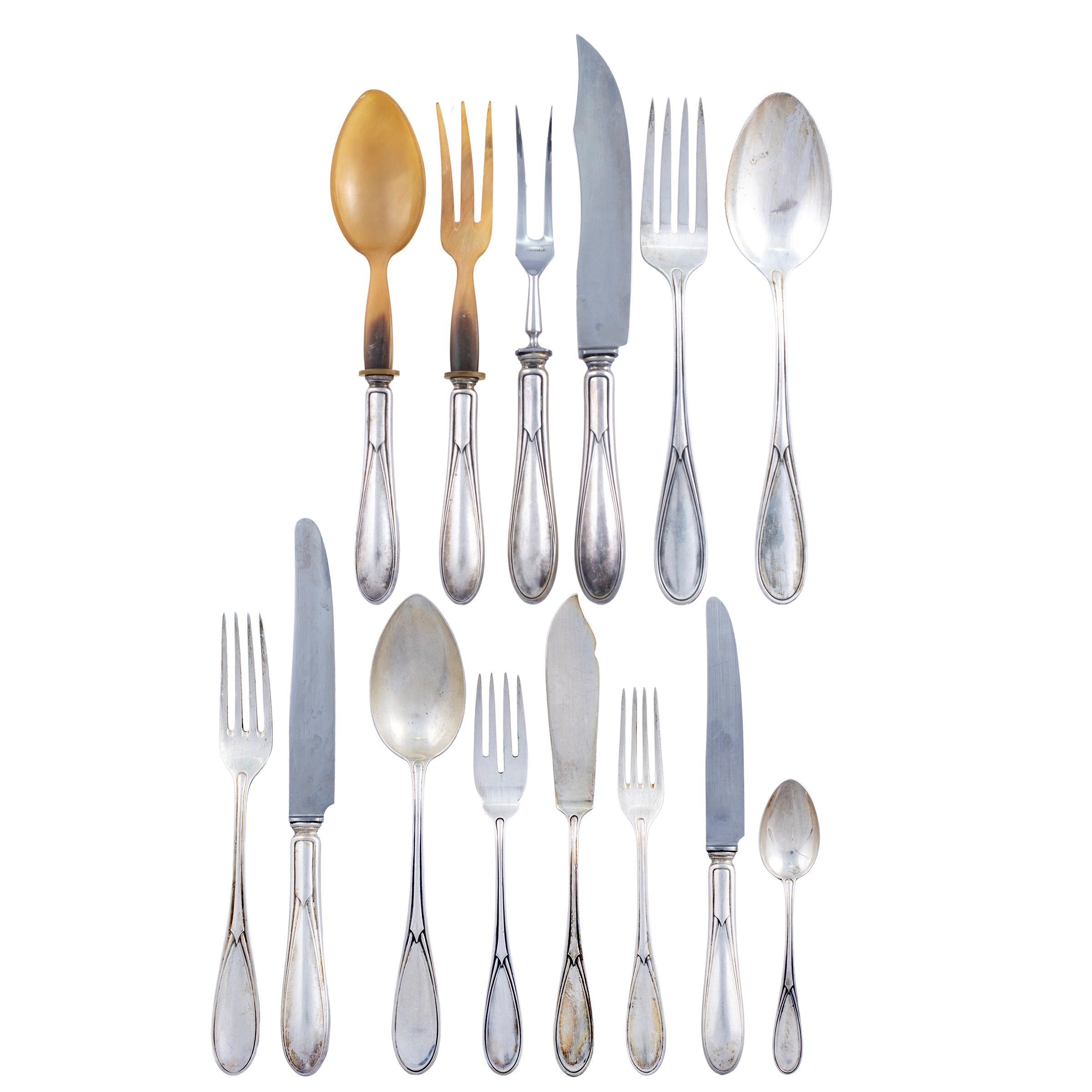 peso complessivo 4618 gr. Italia, XX Sec. orafo Clementi, Bologna, composto da: 12 forchette 12 coltelli 12 cucchiai 12 forchette da pesce 12 coltelli da pesce 12 forchette da frutta 12 coltelli da frutta 12 cucchiaini da caffè 6 posate da portata un mestolo