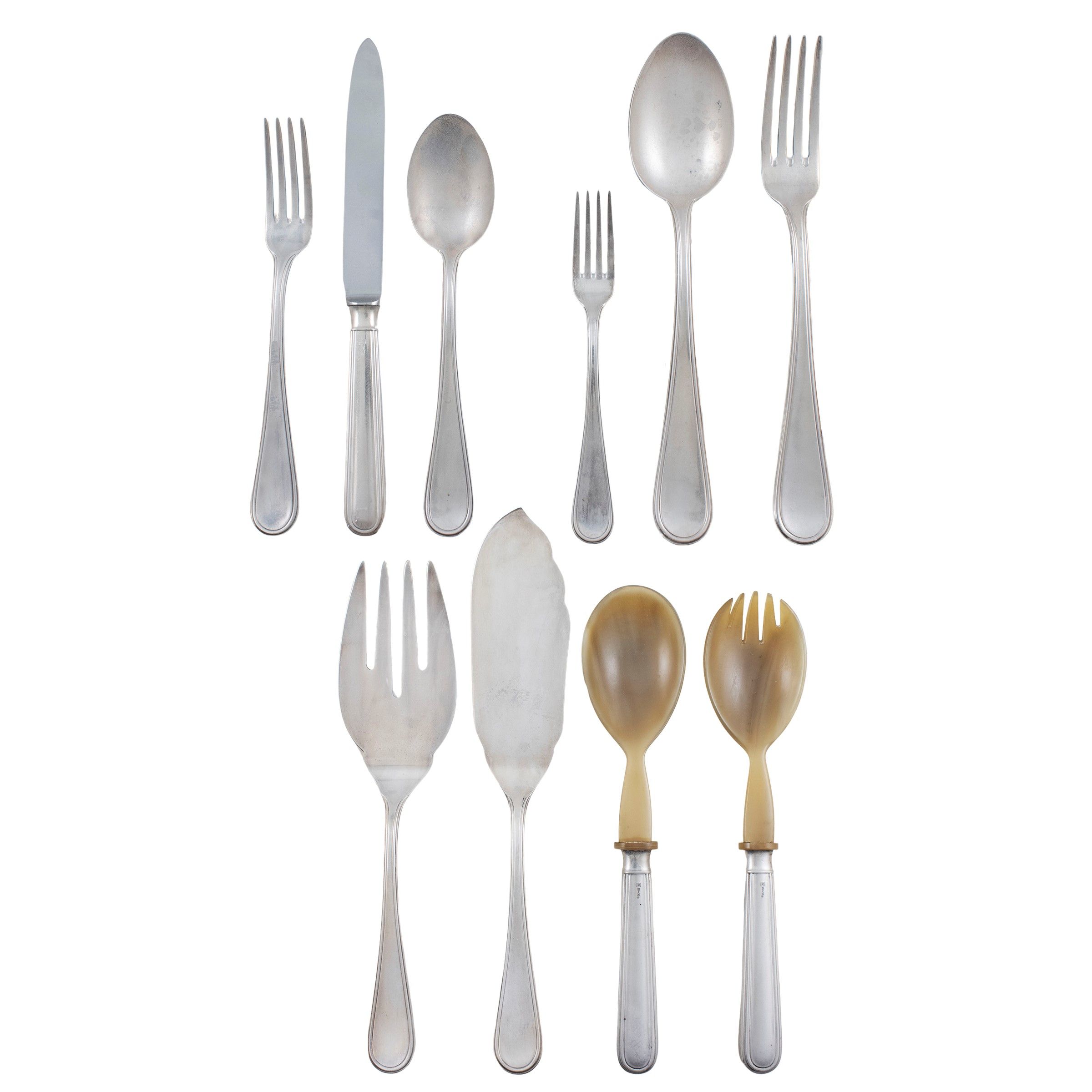 peso complessivo 6756 gr. Italia, XX Sec. orafo Schiavon Angelo, Treviso, stile inglese, composto da: 24 forchette 12 coltelli 12 cucchiai 12 forchette da frutta 12 coltelli da frutta 12 forchettina da dolce 12 cucchiai da the 12 cucchiaini da caffè 12 forchette da pesce 12 coltelli da pesce una coppia di posate da pesce una coppia di posate da legumi un mestolo una coppia di posate da insalata