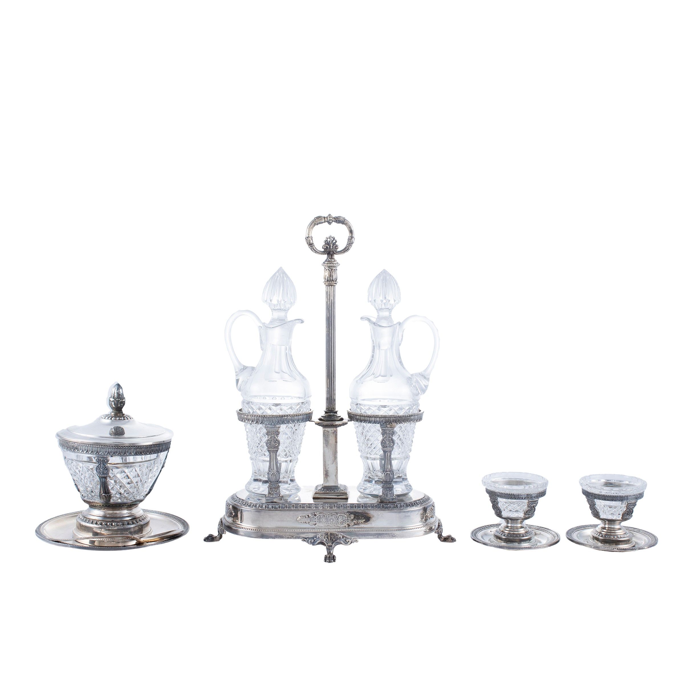 Italia, XX Sec. orafo Ricci & co, Alessandria, corpi cesellati con motivi di palmette Impero, composto da : un' oliera in argento con due ampolle in cristallo molato con tappi, 33x26x14 cm. una formaggera in argento con interno in cristallo molato, completa di relativo cucchiaino, 17x15 cm. 2 saliere in argento con interno in cristallo molato, complete di relativi cucchiaini, 6x8 cm.