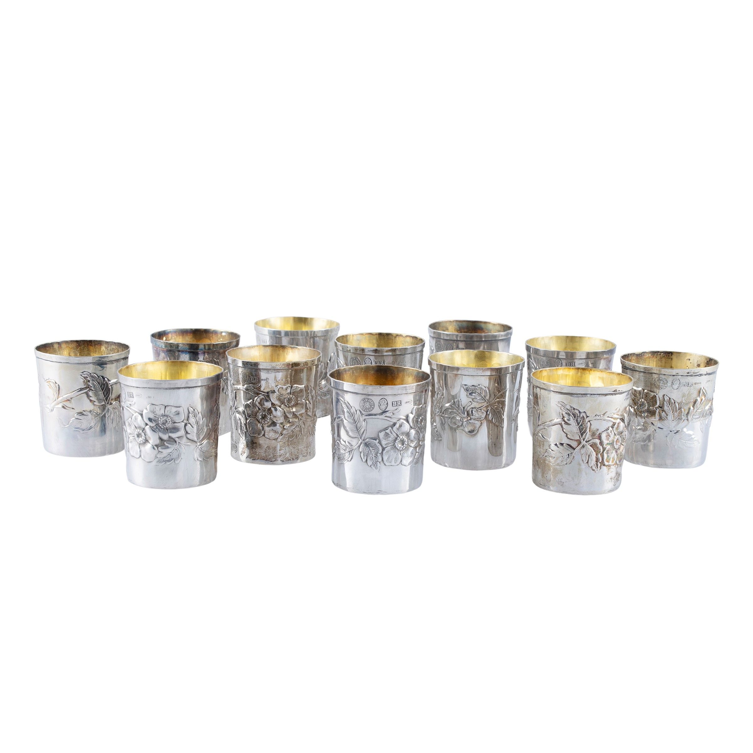 Italia, XX Sec. orafo Brandimarte, Firenze, corpi sbalzati e cesellati con motivi floreali, interni in vermeil, peso complessivo 360 gr.