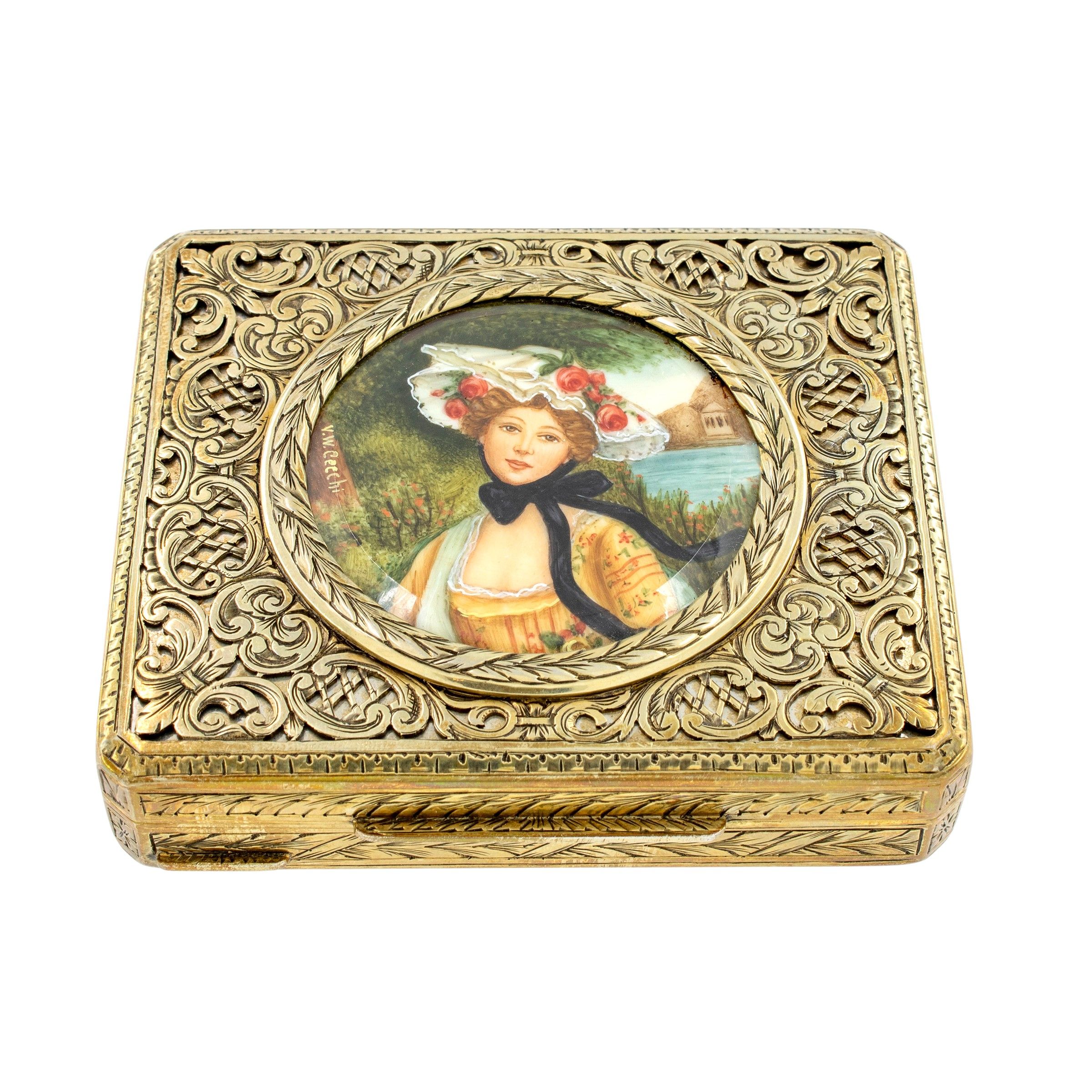 Italia, XX Sec. orafo Renato Salimbeni, Firenze, corpo inciso e traforato con ricche volute vegetali, coperchio centrato da una miniatura raffigurante una giovane fanciulla, con cappello, firmata V.W. Cecchi, peso 148 gr.