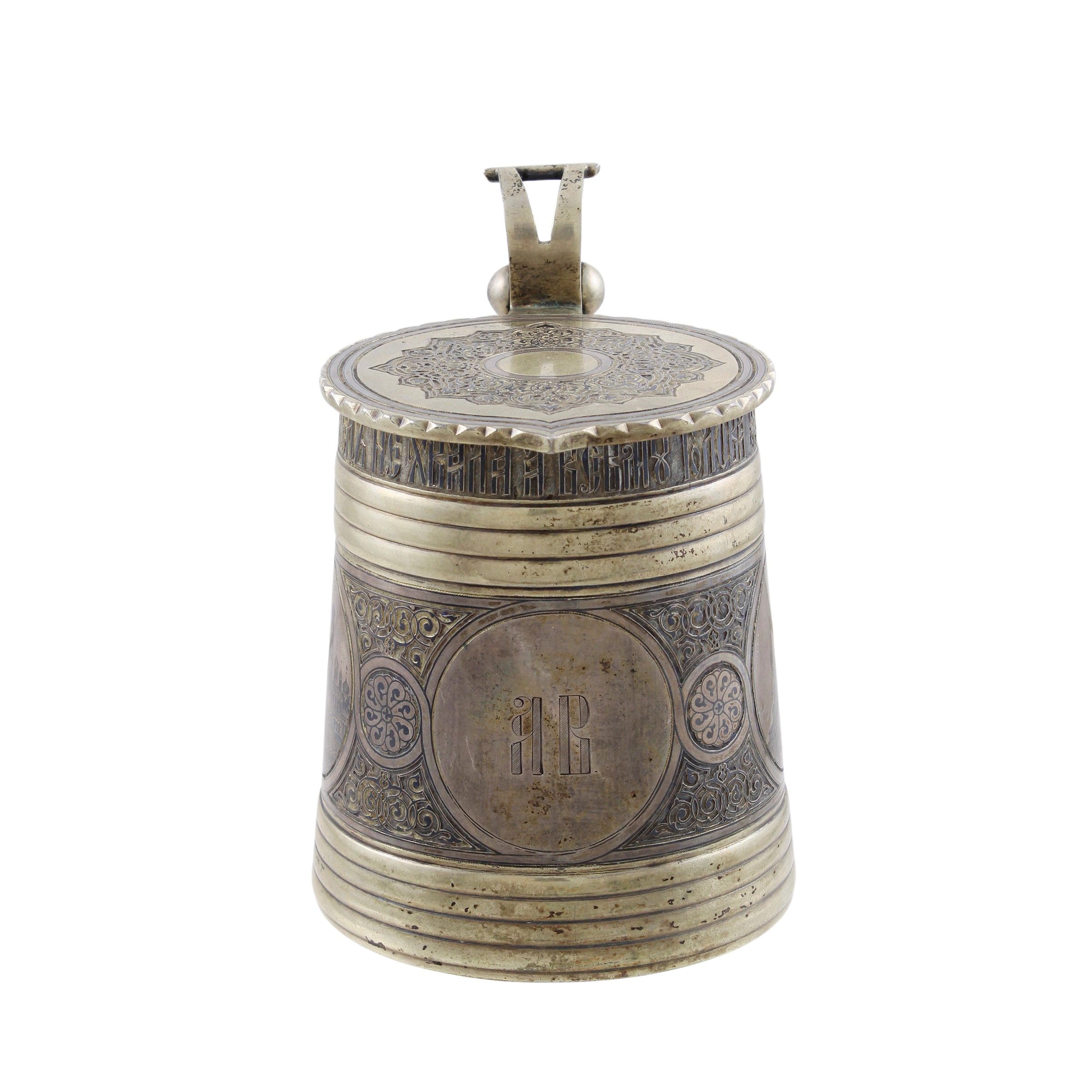 Mosca, 1868 saggiatore Viktor Savinkov, corpo liscio inciso con vedute di Mosca e monogramma entro riserve circolari, manico sagomato e coperchio con profilo cesellato peso 518 gr.