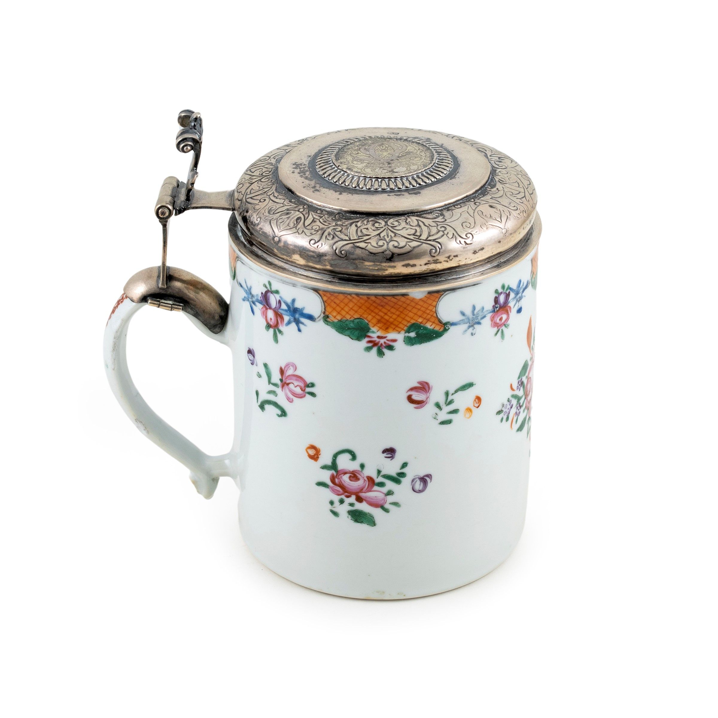 Inghilterra, XVIII-XIX Sec. corpo in porcellana decorata con motivi floreali, coperchio in argento cesellato con volute vegetali, difetti
