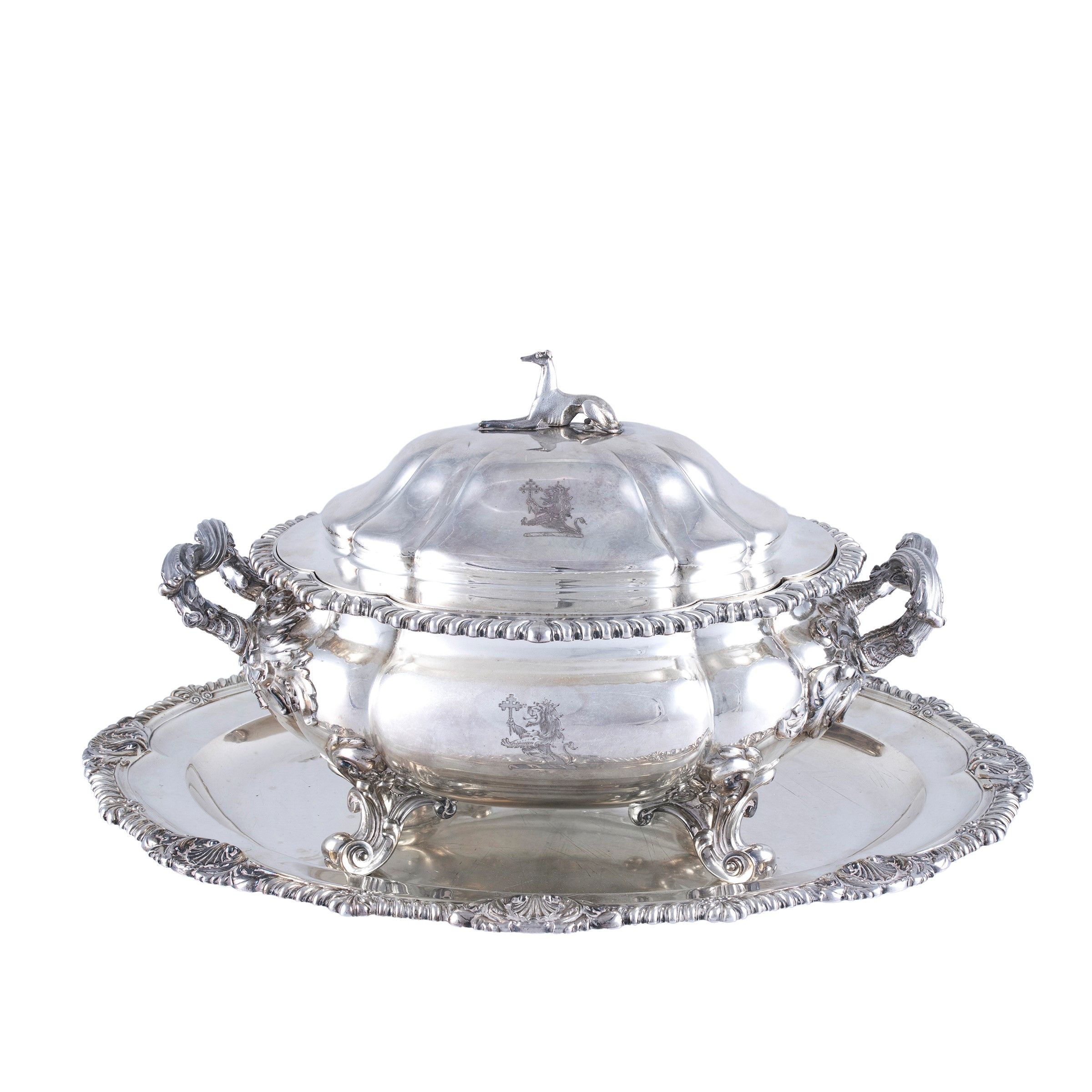 Londra, 1813 orafo Paul Storr, corpo di sbalzato con bordo ornato da baccellature, manici laterali a foggia di volute vegetali intrecciate, presa del coperchio a foggia di levriero, piedini a riccio, completa di présentoire con analoga decorazione, Londra 1826, orafo John Bridge, peso complessivo 5430 gr.