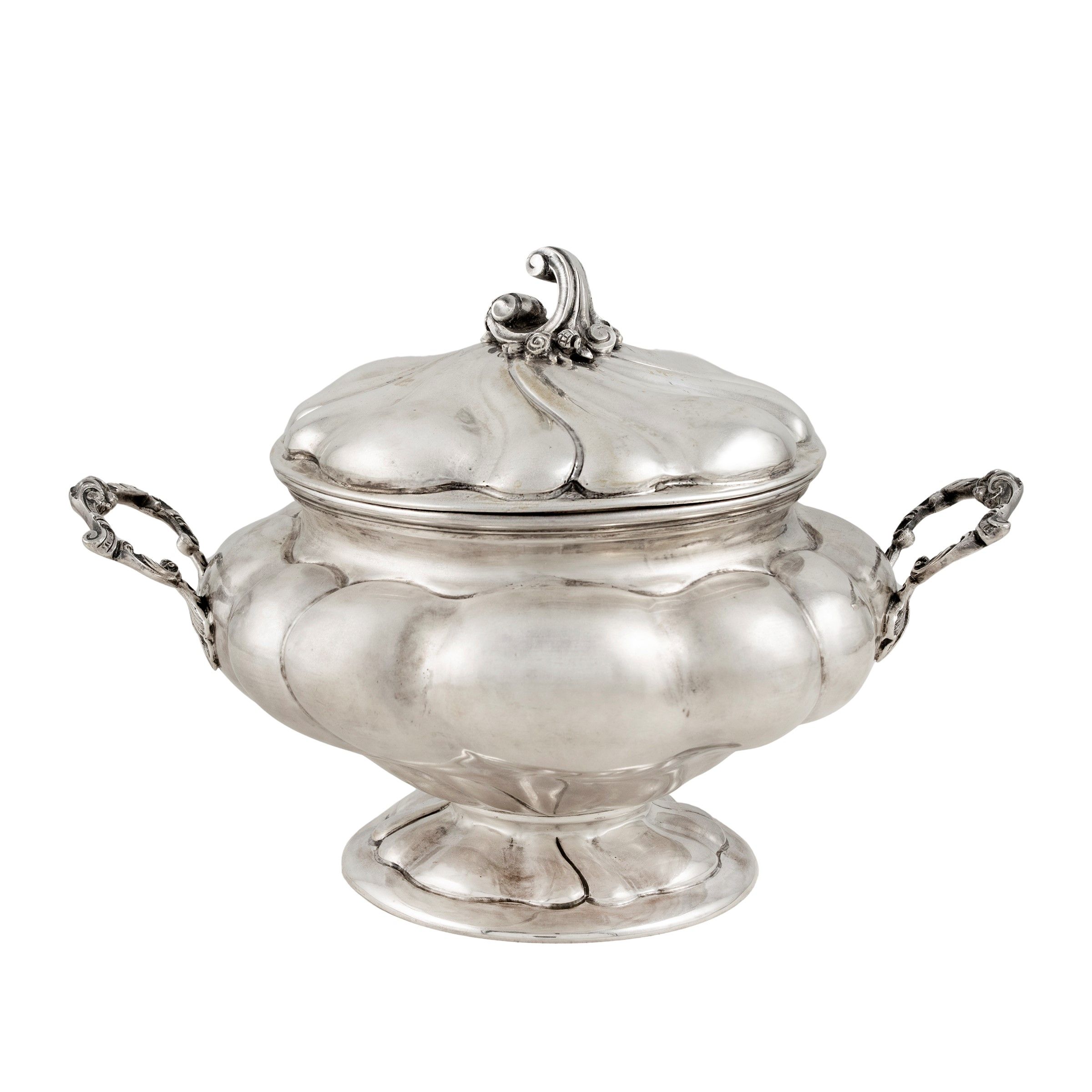 Italia, XX Sec. corpo baccellato, manici sagomati, coperchio con presa a foggia vegetale, peso 1300 gr.
