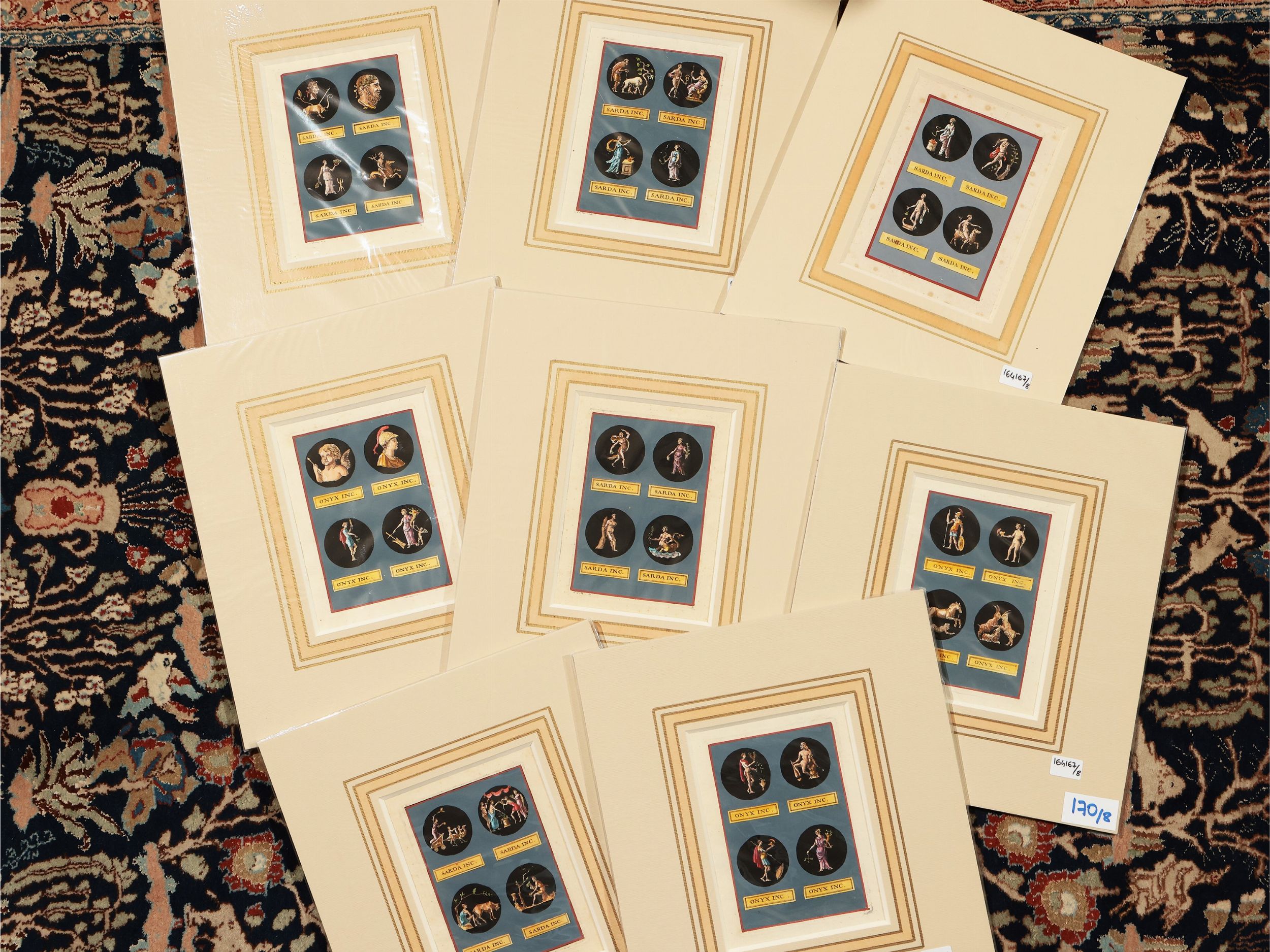 XVIII secolo otto incisioni su rame, colorate, con passe-partout, tracce di foxing