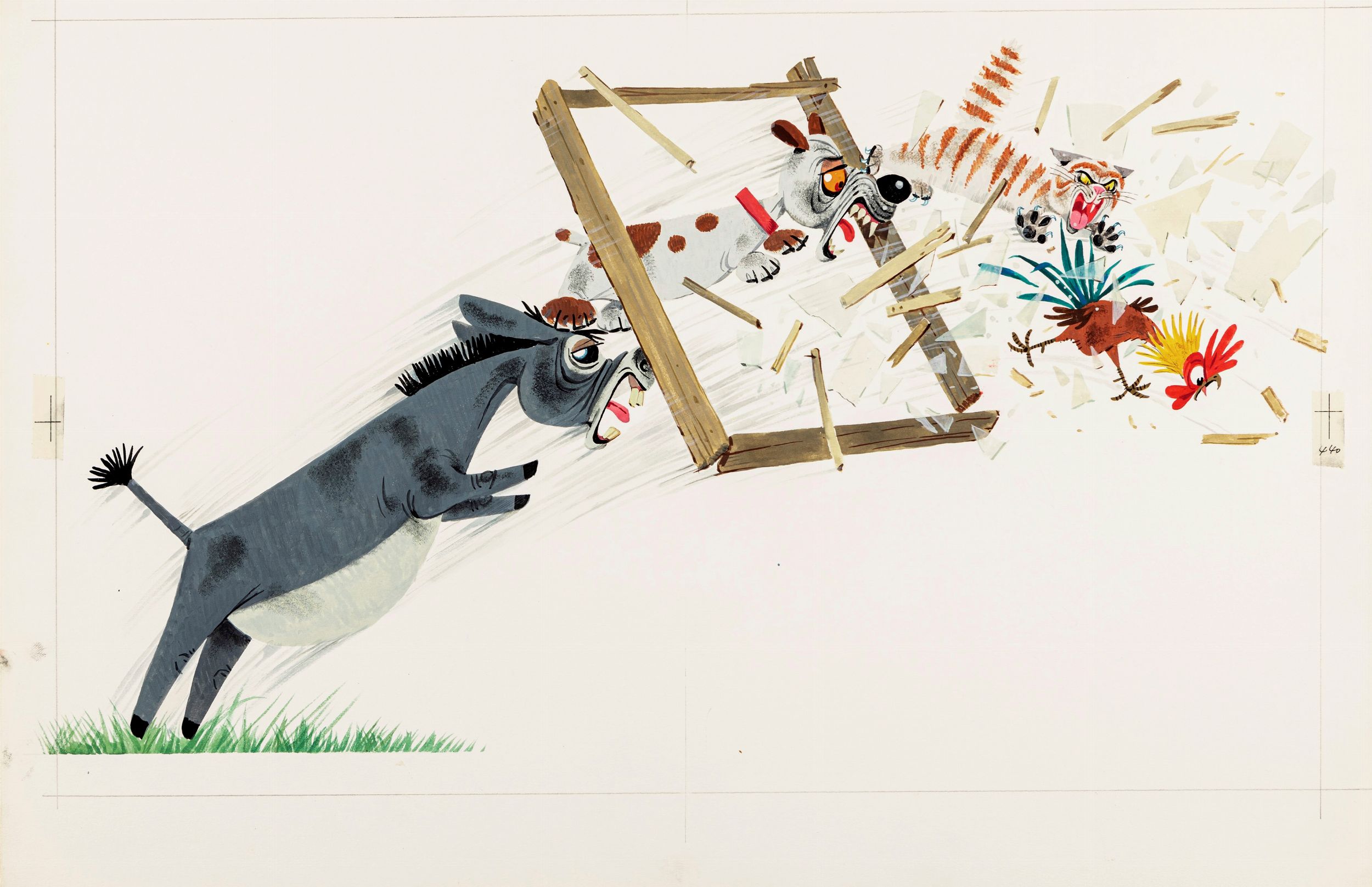 anni 70 Illustrazione originale realizzata da Maraja per la fiaba 'I musicanti di Brema' edita negli anni '70.
