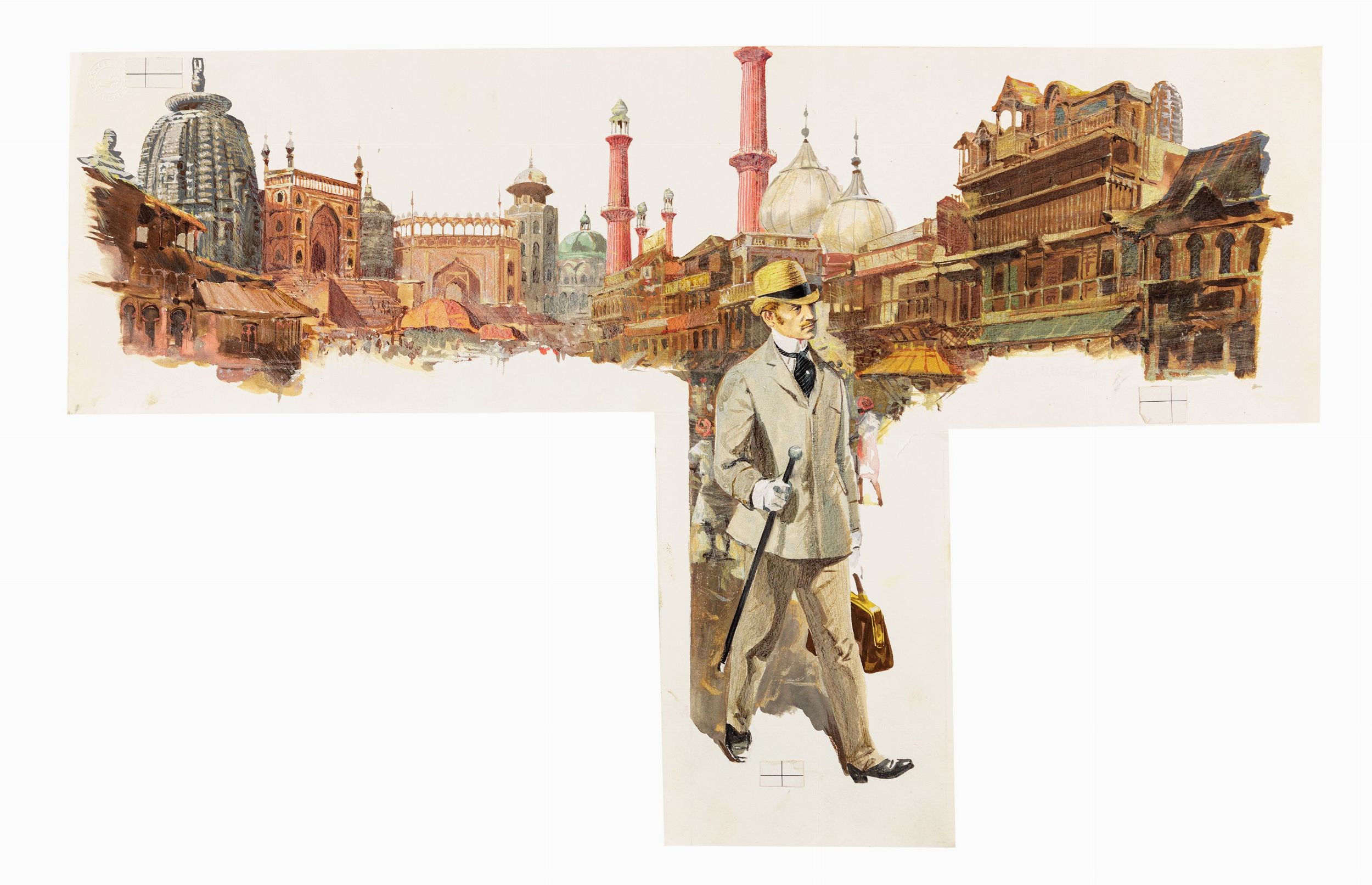 1961 Illustrazione originale realizzata da Maraja per il romanzo 'Il Giro del Mondo in 80 giorni' di Jules Verne edito nel 1961. Piccolo strappo.