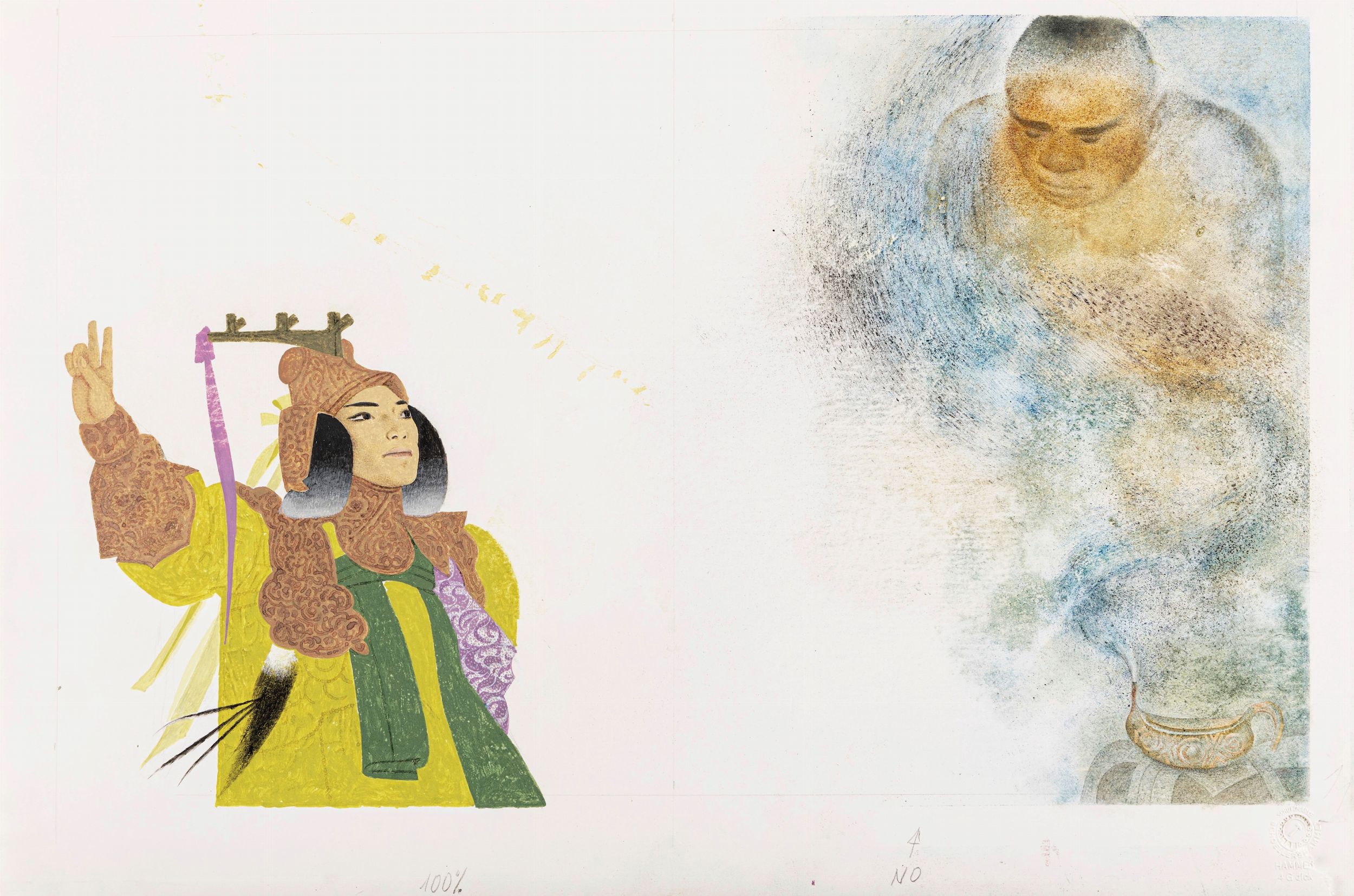 1982 Illustrazione originale realizzata da Fontana per la fiaba 'La lampada di Aladino' edita nel 1982. Strappo all'angolo inferiore destro.