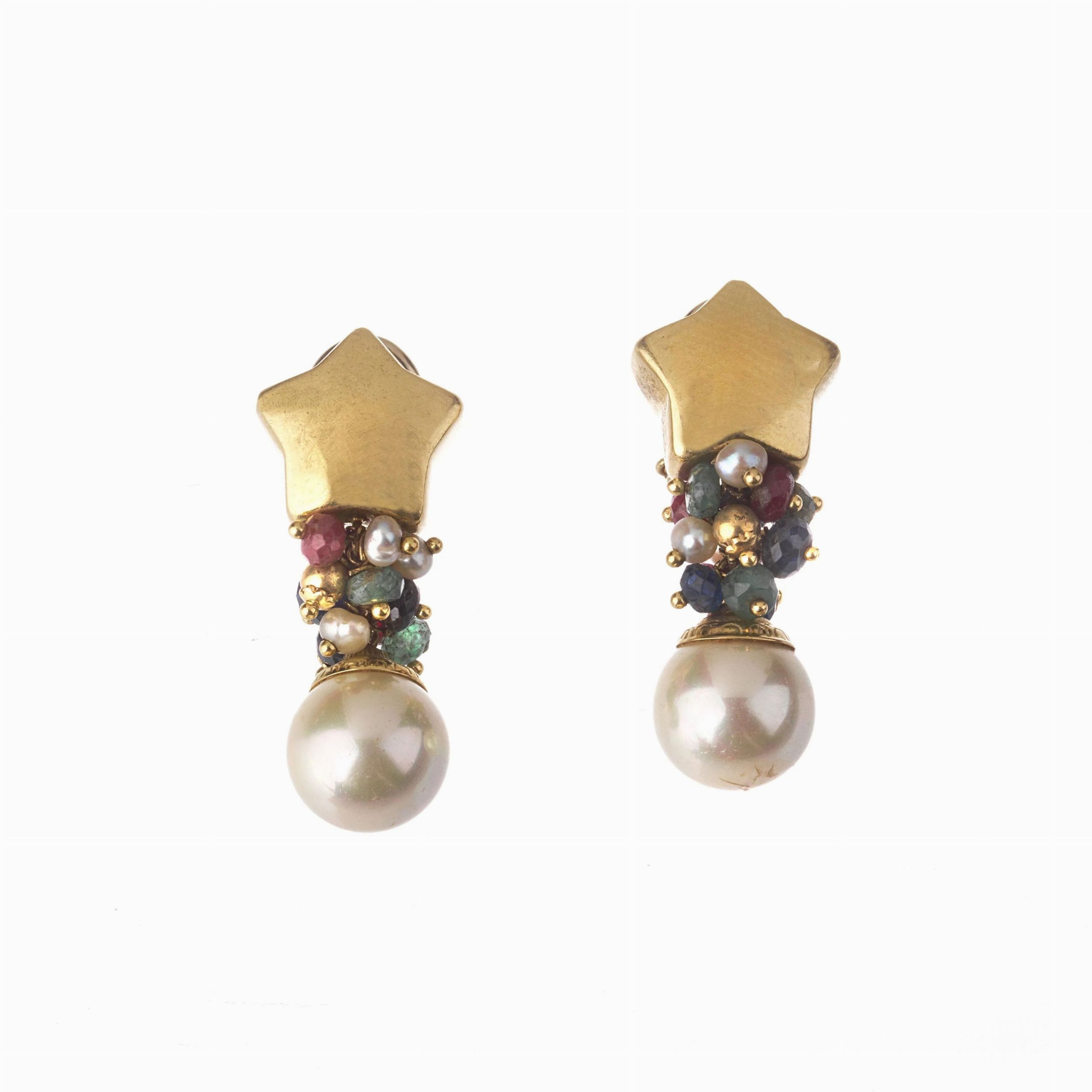 PAIO DI ORECCHINI PENDENTI CON PERLE E PIETRE DI COLORE