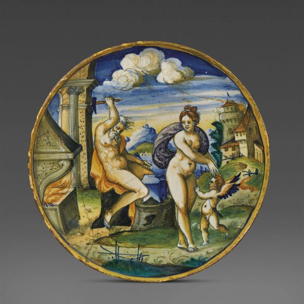 La coppa ha forma emisferica su alto piede con largo cavetto piano che si alza in una tesa appena arrotondata e orlo arrotondato listato di giallo. Sul fronte una scena istoriata con tre personaggi: a sinistra Vulcano intento a foggiare sull’incudine, mentre sulla destra Venere che stringe teneramente la mano di Cupido per evitare che si accosti troppo. Alle spalle del dio la fornace architettonica in cui arde il fuoco e ancora un’ampia quinta con colonne, mentre a destra si apre un paesaggio con una città turrita con case dai tetti spioventi. Come d’uso nella maiolica istoriata il pittore ha attinto per realizzare la scena da una stampa di Marco Dente (Bartsch XIV.184.227) che raffigura la Fucina di Vulcano, utilizzando però solo alcuni dei personaggi e inserendoli in un paesaggio di più ampio respiro. Lo stile pittorico è quello della bottega di Mastro Domenico tra il 1555 e il 1575, e l’attribuzione alla bottega veneziana si basa anche sulla qualità della mano, che ritroviamo solo in alcune opere istoriate con figure, soprattutto femminili, con la pelle sottile chiara, quasi eburnea, ma anche sapienti tocchi di bianco di stagno a sottolineare alcuni minimi particolari, come ad esempio le dita dei piedi dei personaggi o l’uso del verde scuro in alcune parti del piatto. Il volto di Vulcano e i tratti sottolineati con il manganese nel volto di Venere li ritroviamo in alcuni dei ritratti tipici delle opere a forma chiusa della bottega, ma anche nei rari piatti firmati dal maestro, come il grande piatto del “1568”, del Museo di Faenza. La parte “istoriata”, quasi urbinate, come pure la morfologia dell’opera trovano un confronto illustre in una nota coppa a fondo giallo di Xanto Avelli del British Museum di Londra (inv. n. 1878,1230.373), più prossima all’incisione. La presenza degli elementi architettonici, delle architetture con i tetti spioventi e altri elementi, che troviamo raffigurati ad esempio nella coppa con piede tagliato del Museo Tarnów in Polonia (inv. n. MT.II.353), o ancora il confronto con la figura di Cupido in un piatto del Castello Reale di Wawel (inv. n. 1752), dove anche le figure femminili sembrano corrispondere alla soavità della protagonista della nostra coppa, ci confortano nell’attribuzione.