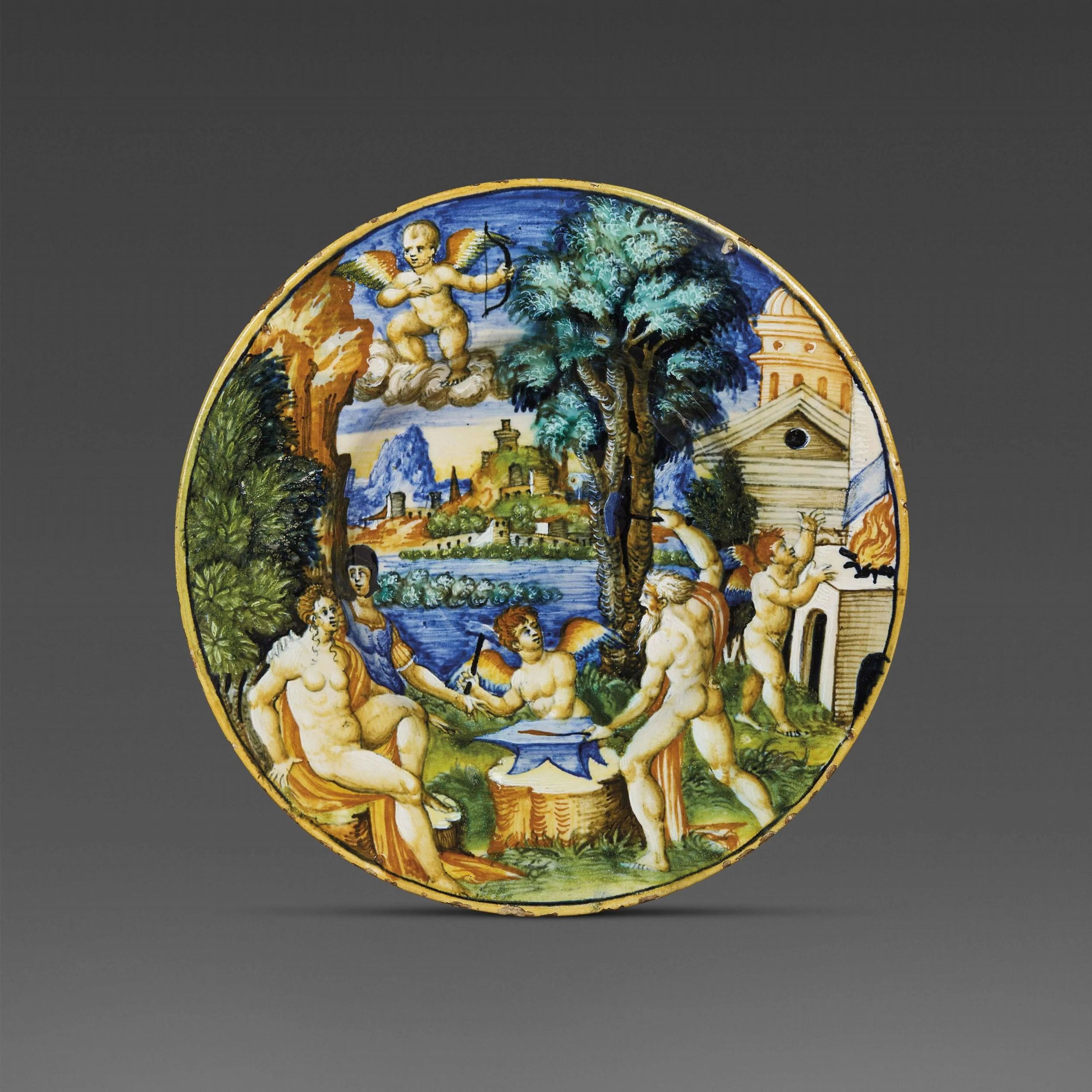 Lo stile pittorico è quello delle figure della coppa del Museo di Pesaro con Apollo e Dafne , datata 1545 (Inv. Coll. Mazza, cas. 99; Rs 239, Gp317). La figura di amorino con ali colorate dal volto piccolo, le muscolature toniche e arrotondate, alcune modalità nel delineare i paesaggi, come l’alta collina con alcune case ombreggiate in verde, presenti su una coppa con Pasifae e Dedalo del Museo di Arezzo (inv. n.14648) e confrontabili con il nostro piatto ci portano all’ambiente del ducato di Urbino e in particolare alle opere della bottega di Lanfranco dalle Gabicce. Le stesse modalità stilistiche si ritrovano tuttavia in altre tre opere con scene mitologiche, due coppe e un piatto attribuite alla bottega Fontana tra il 1545 e il 1555, recentemente pubblicate e attualmente esposte nelle nuove sale delle Ceramiche dei Musei Vaticani (inv. nn. MV62267, MV62266, MV62274), attribuite alla mano di un medesimo pittore. L’attribuzione comunque prudenziale non esime dal riconoscimento di una mano pittorica univoca da assegnare al ducato di Urbino.